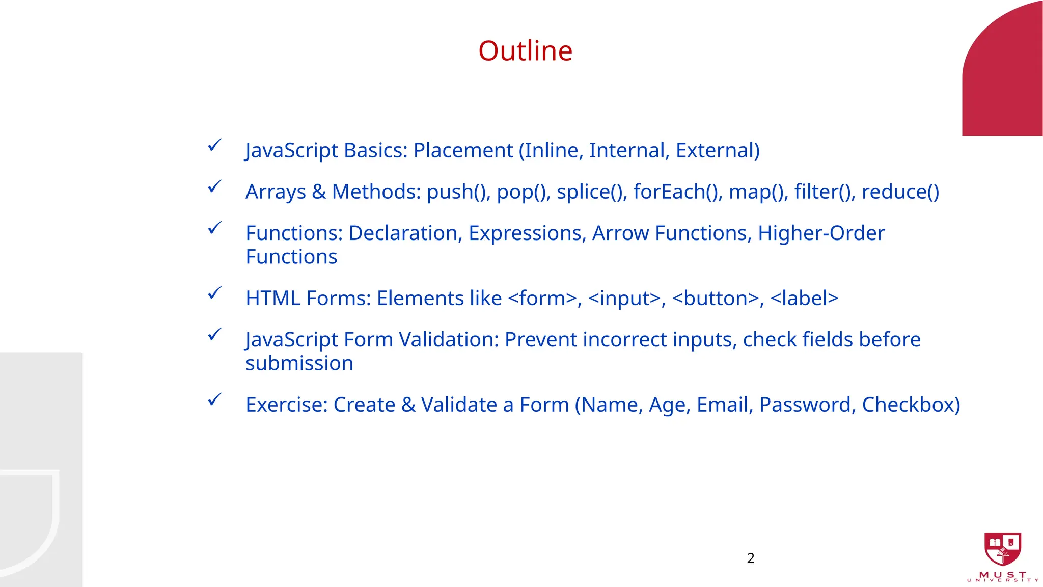 Arrays & Methods: push(), pop(), splice(), forEach(), map(), filter(), reduce()