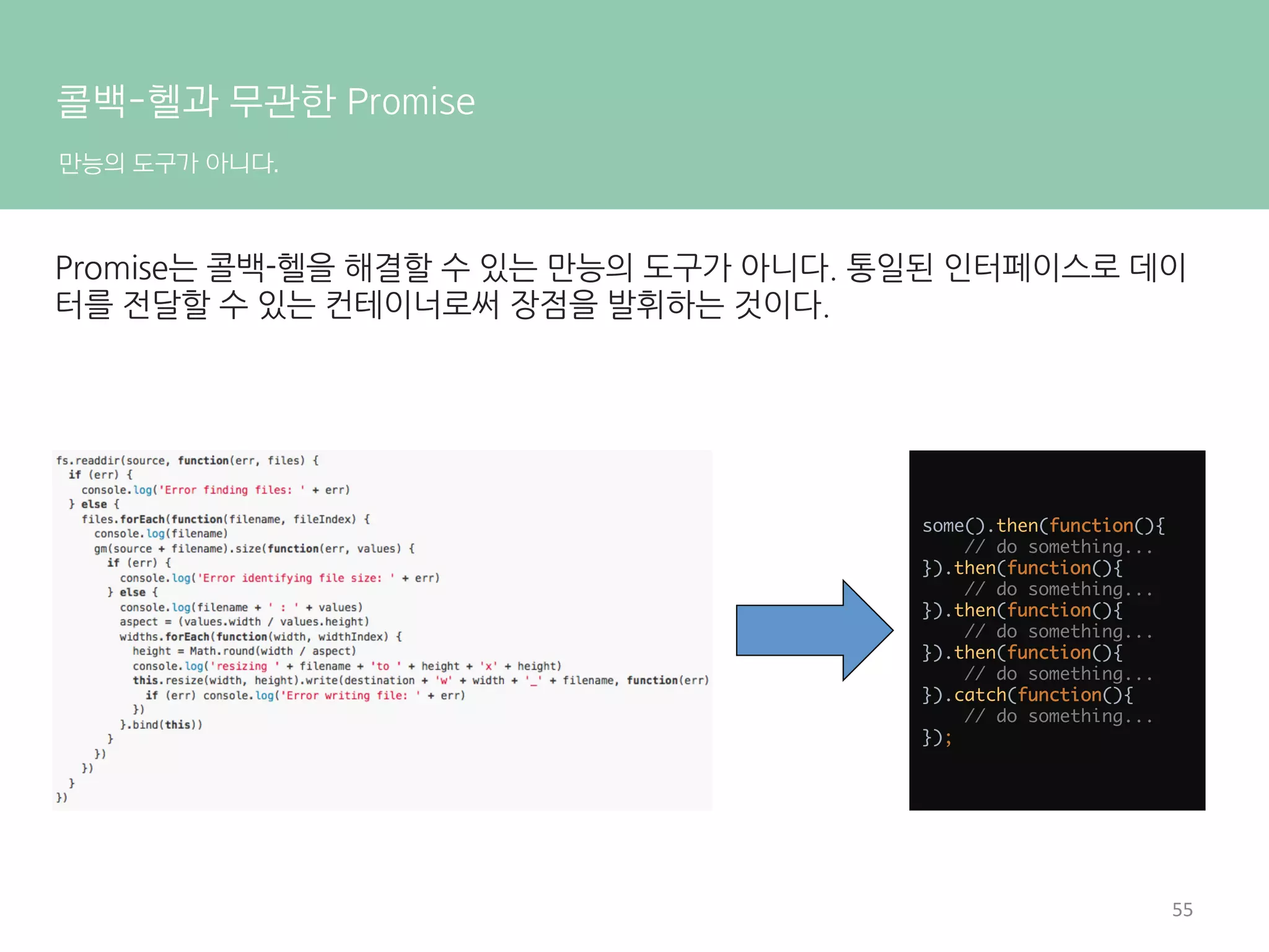 전통적인 콜백 패턴을 단순하게 변환한 것으로 큰 의미는 없어 보이지만, Promise의 근본적인 철학은 이미 다루고 있다.