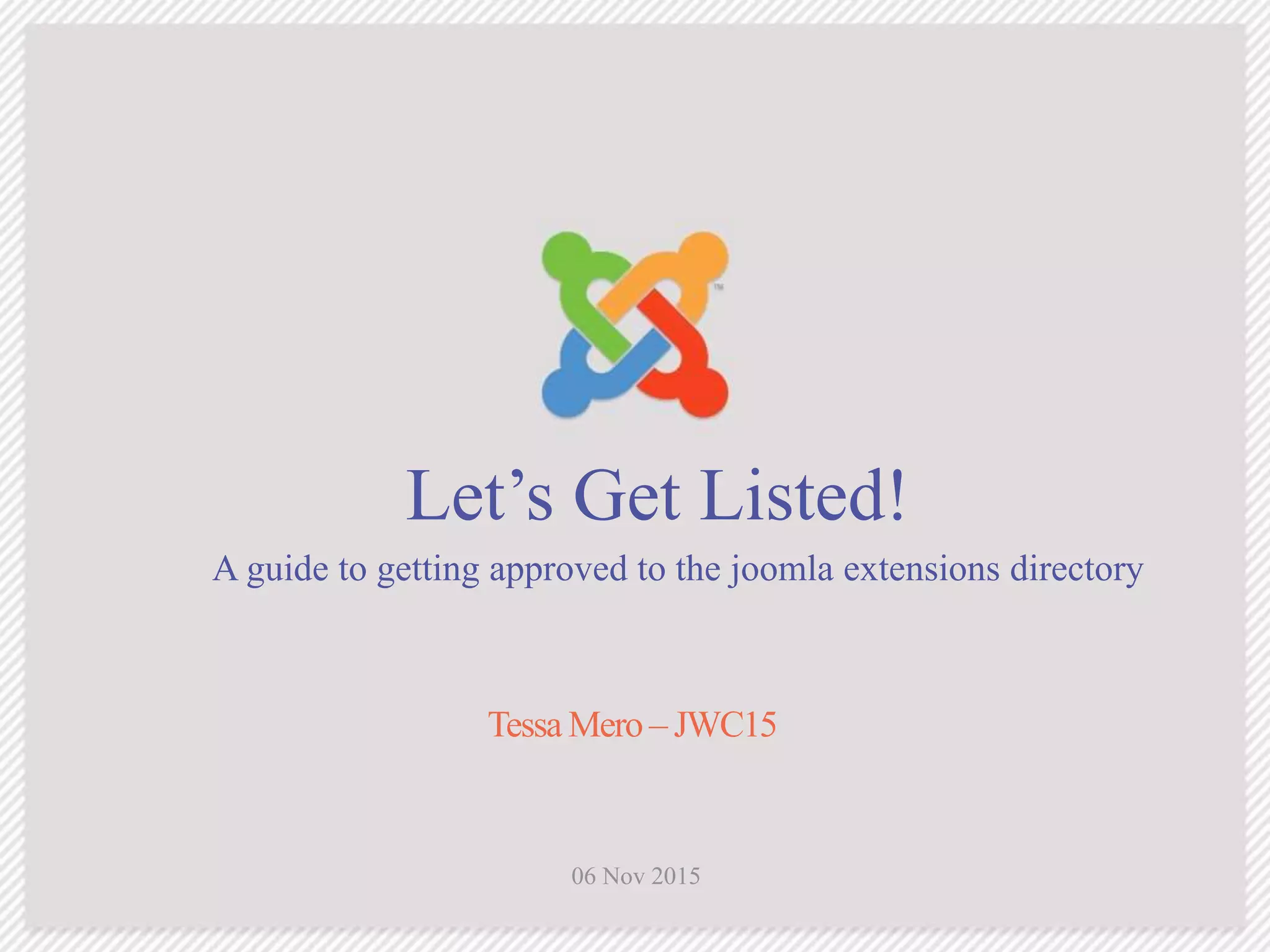 This document provides a guide to getting an extension approved to the Joomla extensions directory. It discusses important things to consider for the extension name and title, running the JEDChecker tool to check for errors, other basics like having both a free and paid version, properly forking another extension by changing 30% of the code and mentioning the original developer, details about the JED review team and their roles, and how to get involved with the JED 3.0 project by accessing their public repositories and issue trackers.