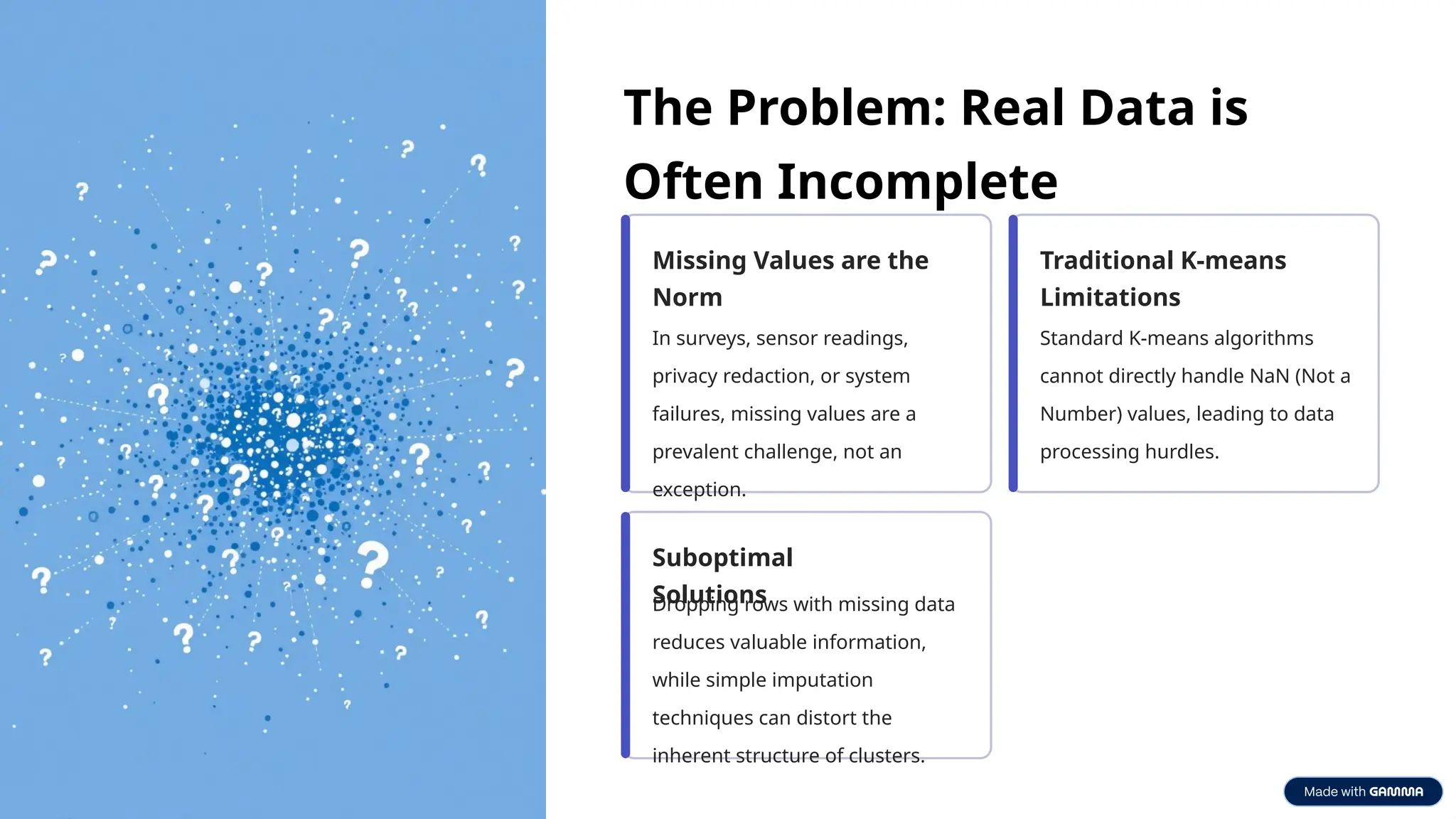 • Crucially, missing values are not just ignored or pre-filled but treated as active variables within the optimization.