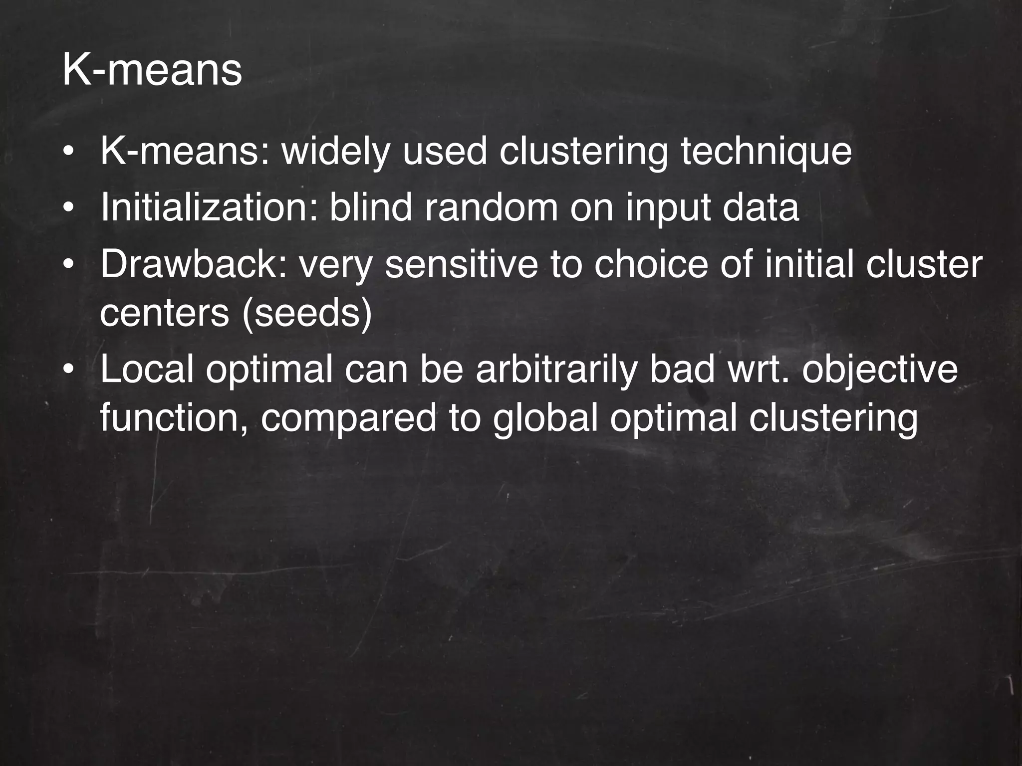 The document describes the k-means++ seeding algorithm for initializing k-means clustering. It presents the k-means++ algorithm, provides an implementation in MLDemos, and evaluates it on test and real datasets. The results show k-means++ yields a significant reduction in clustering error compared to random initialization, providing better separation of clusters. However, the document also notes there are many seeding techniques and some may work better than k-means++ for certain datasets.