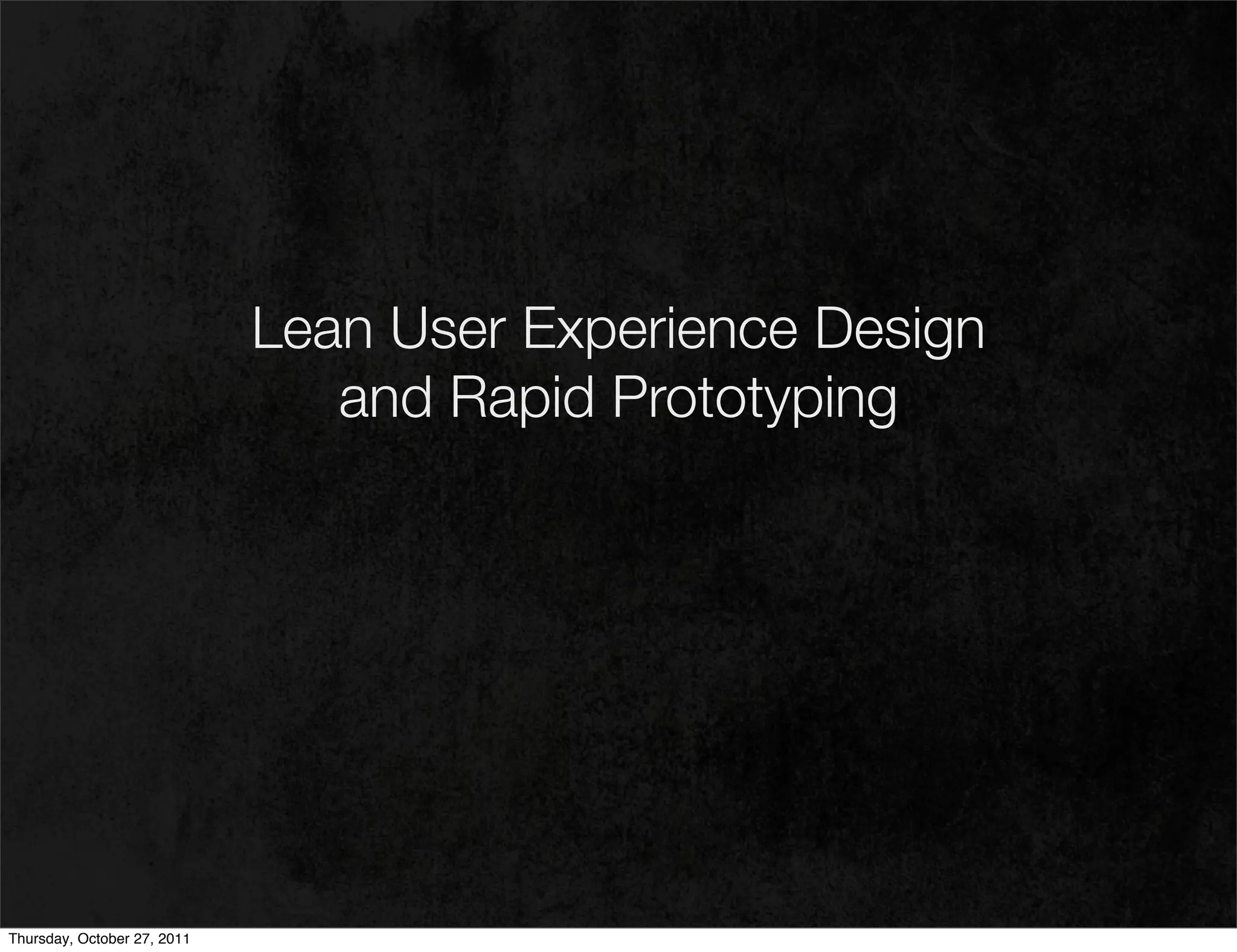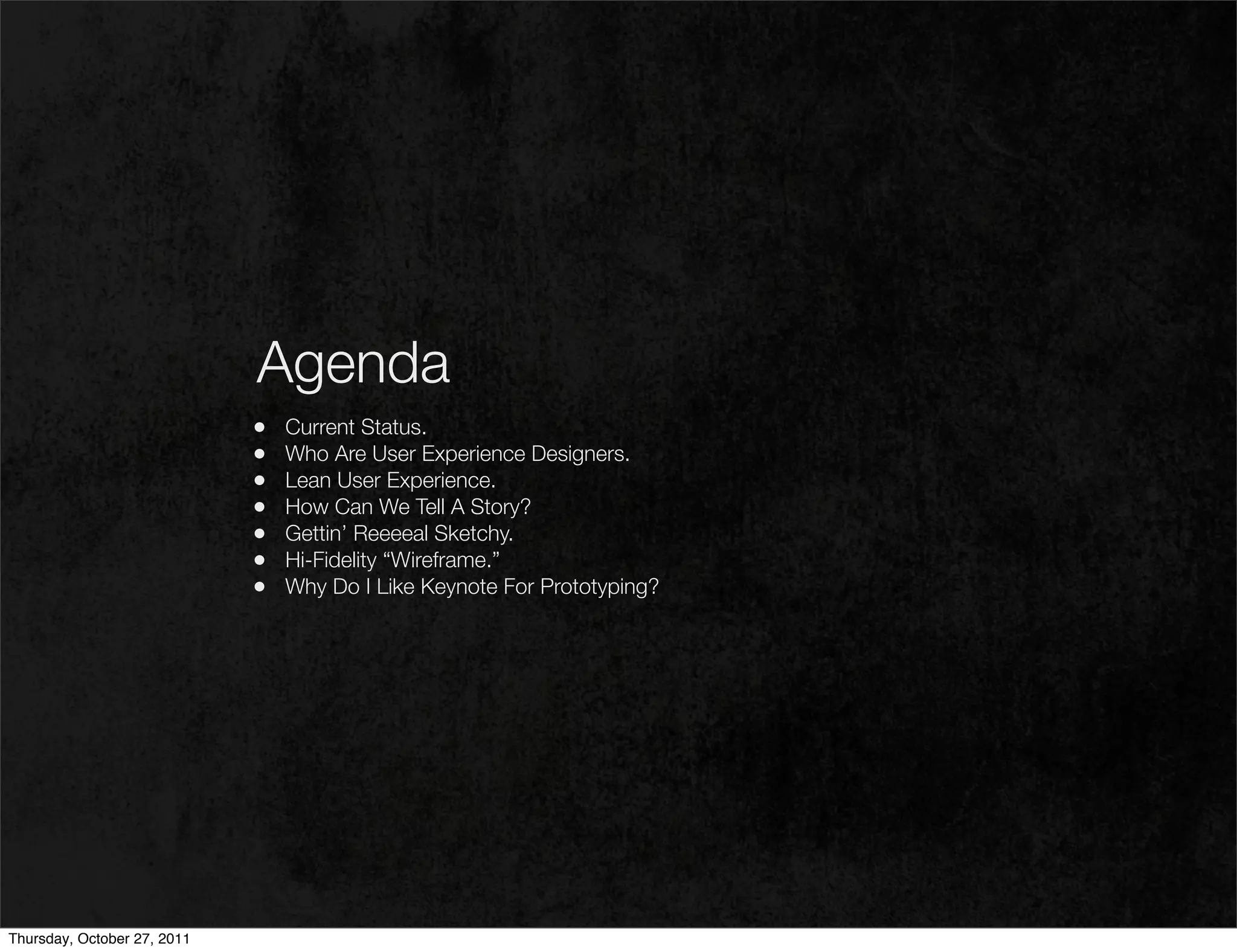 The document discusses lean user experience design and rapid prototyping. It outlines an agenda covering current status, who user experience designers are, lean UX, storytelling, sketching, hi-fidelity wireframing, and why the author likes using Keynote for prototyping. It then discusses moving from traditional UX processes focused on deliverables to a leaner process centered around prototyping and testing designs to understand user experiences. Sketching and interactive prototyping are presented as ways to tell stories and get feedback earlier in the design process.