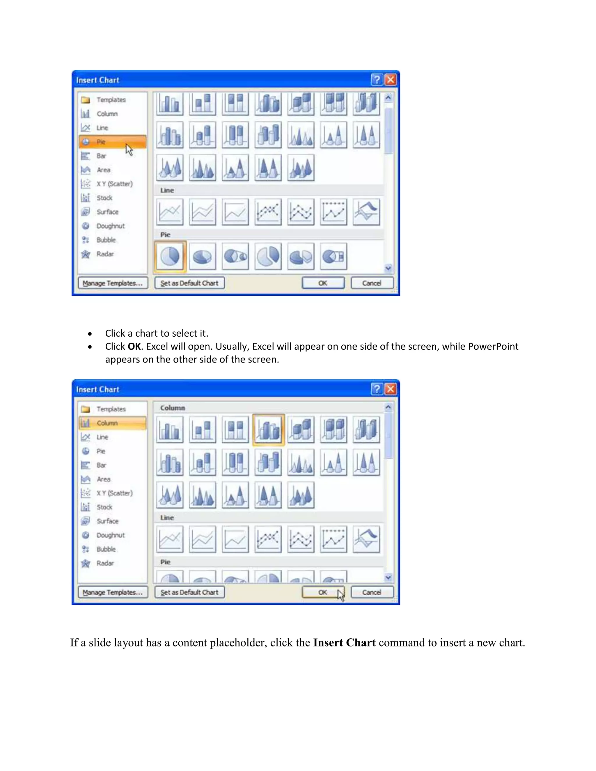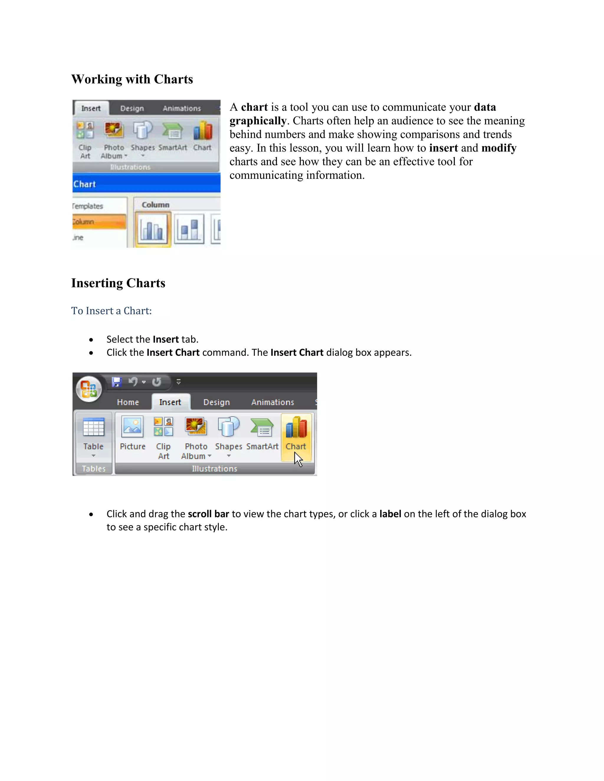 This document provides instructions for inserting and formatting charts in PowerPoint. It discusses how to insert a chart, enter data, change the chart type and style, modify the chart layout, and format specific elements. Charts are a visual way to represent data and make comparisons and trends easy to understand. The instructions cover the basic chart elements like the title, legend, and axes, and how to modify these elements using the Design, Layout, and Format tabs.