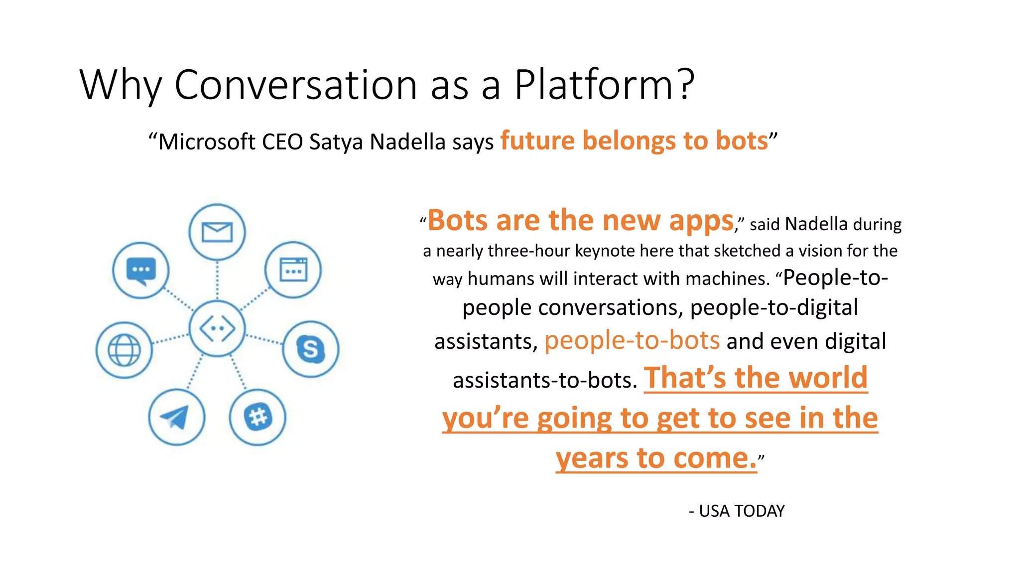 The document discusses Microsoft's vision for the future of bot interactions, emphasizing the integration of bots as a new application platform for communication. It highlights the capabilities of the Microsoft Bot Framework and cognitive services, particularly focusing on the Language Understanding Intelligent Service (LUIS) for natural language processing. Additionally, it showcases a case study on Instaply, which utilizes chatbots to enhance customer experience and optimize sales.