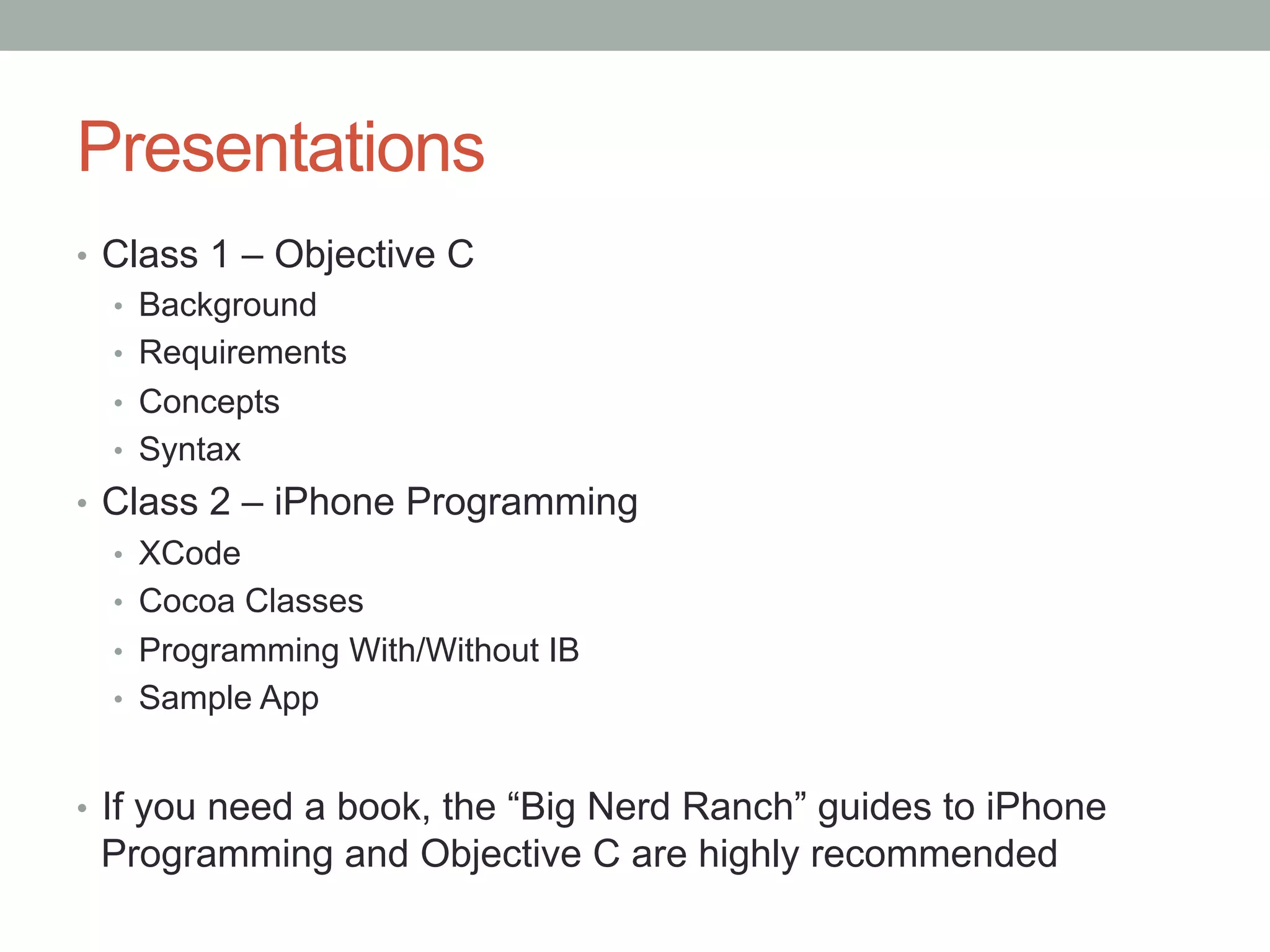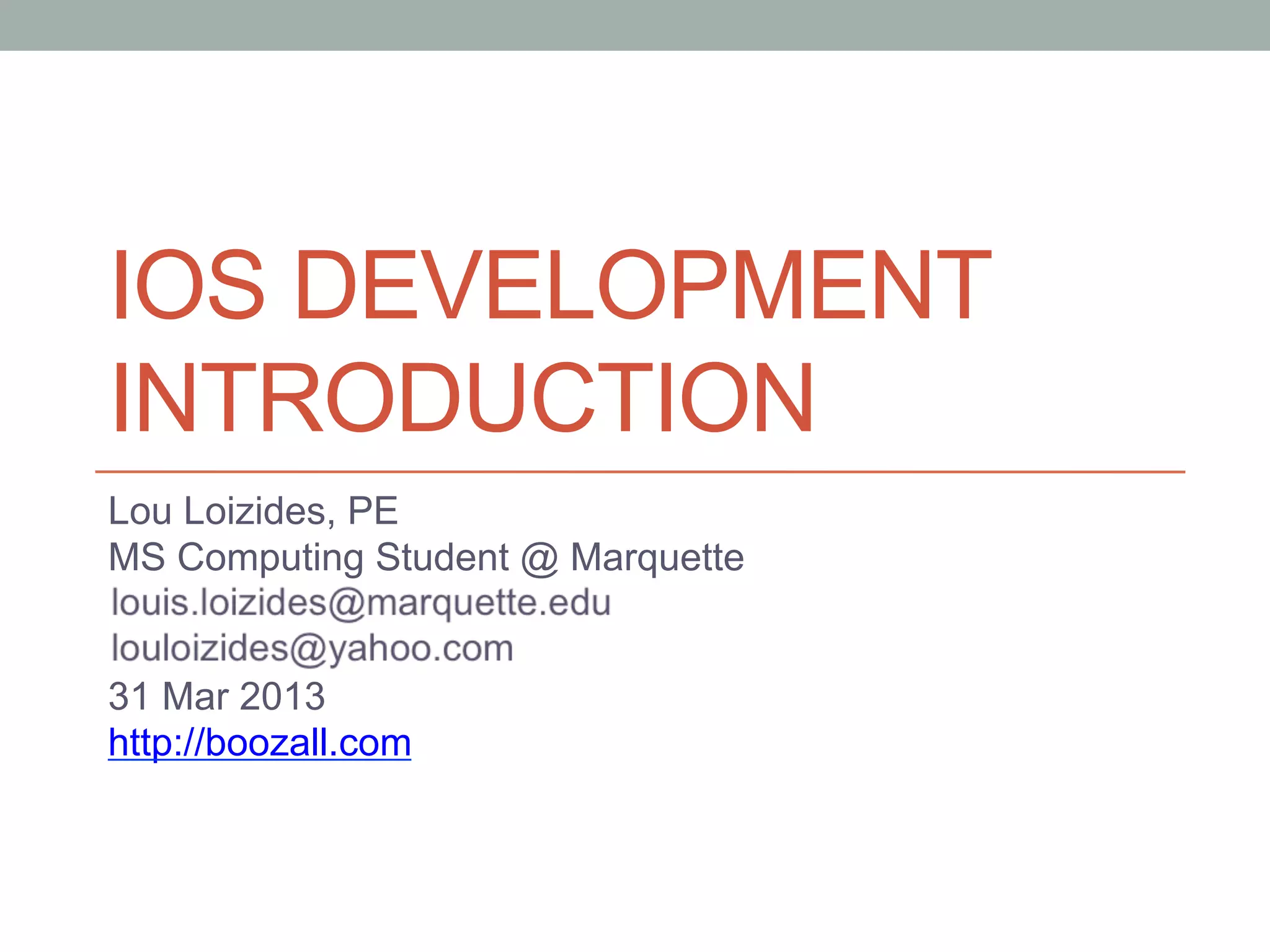 This document provides an overview of iOS development using Objective-C. It discusses key concepts like classes, inheritance, pointers and memory management. It also covers setting up development with Xcode on Mac, and recommends books for learning iPhone programming and Objective-C.