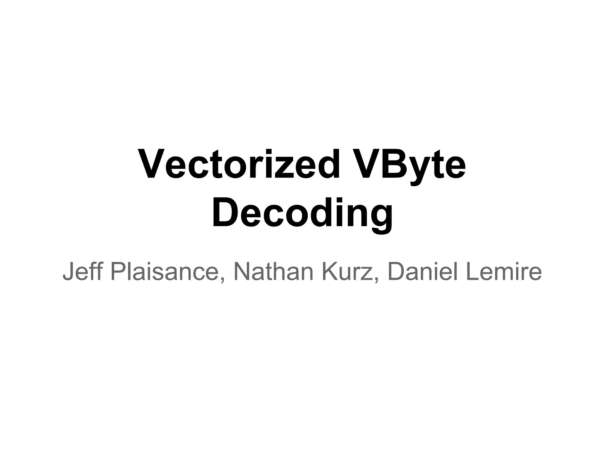 The document discusses techniques for optimizing inverted indexes used for document retrieval, including delta encoding and vectorized VByte decoding. Delta encoding stores the differences between adjacent document IDs rather than the IDs themselves, since differences are usually small integers. VByte encoding compresses these deltas into variable-length bytes. Vectorized VByte decoding decodes multiple VByte-encoded integers simultaneously using CPU intrinsics for improved performance over sequential decoding. It analyzes the variable-length encoding to group integers for bulk decoding in parallel.