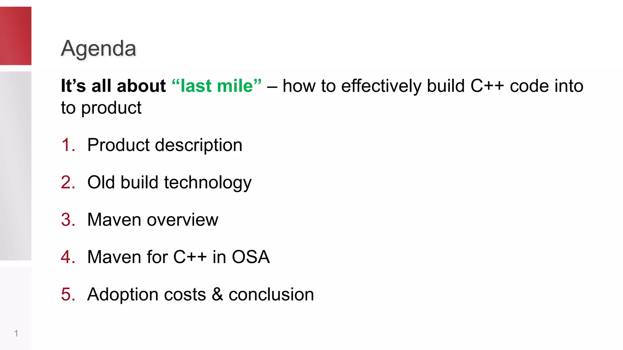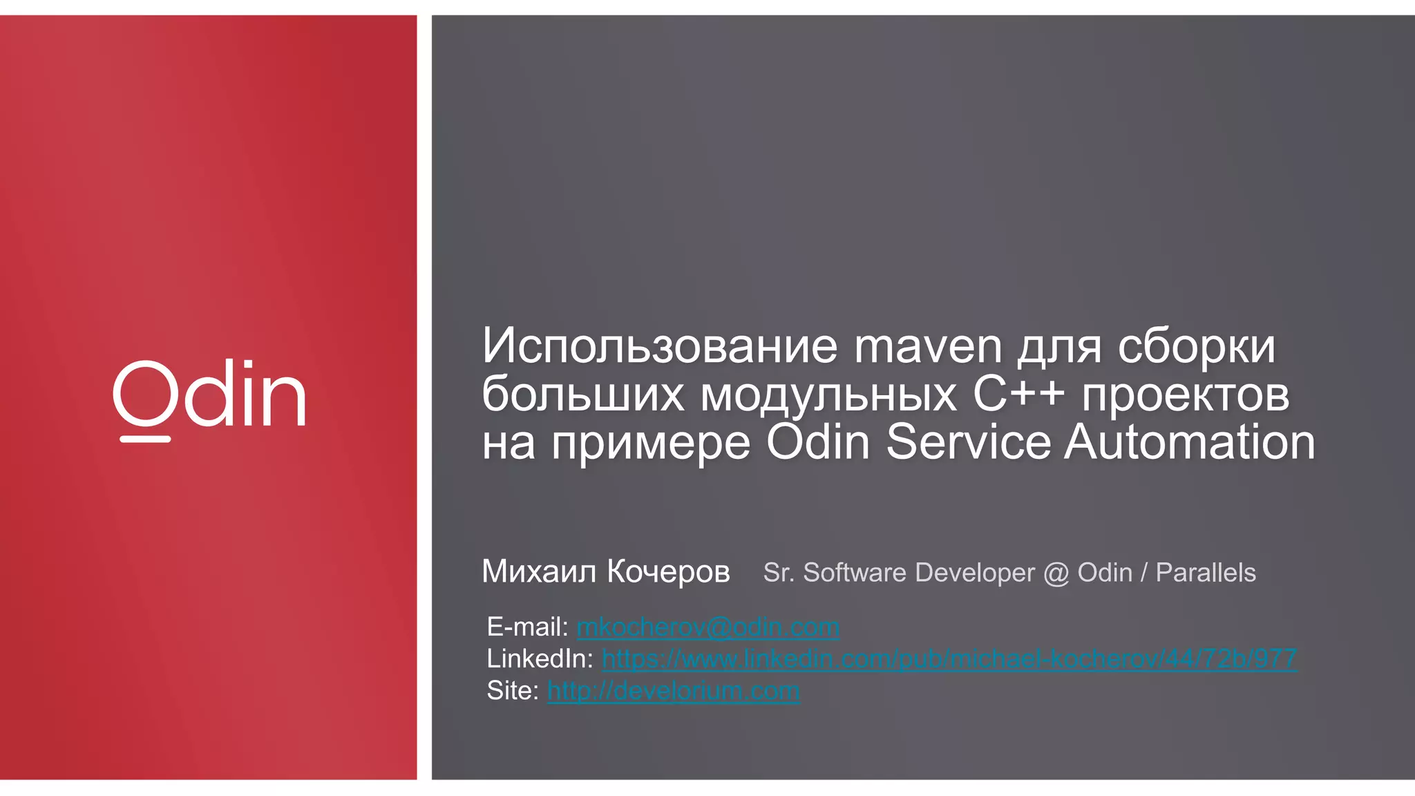 The document discusses the use of Maven for building large modular C++ projects, specifically the Odin Service Automation platform. It outlines the platform's purpose, the drawbacks of an old build system, and the advantages of adopting Maven, such as improved modularity and faster build times. The transition to Maven involved converting over 300 projects and took two years to complete, ultimately resulting in significant reductions in build duration.
