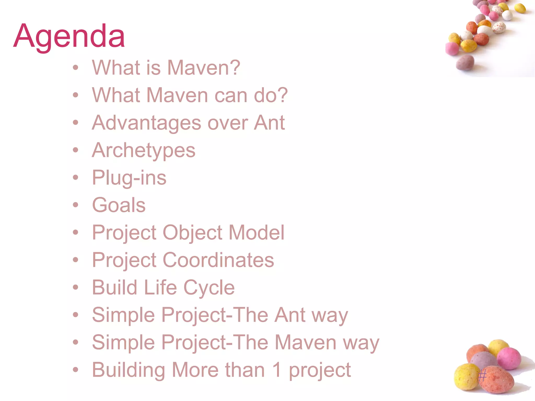 Maven is a build tool that can manage a project's build process, dependencies, documentation and reporting. It uses a Project Object Model (POM) file to store build configuration and metadata. Maven has advantages over Ant like built-in functionality for common tasks, cross-project reuse, and support for conditional logic. It works by defining the project with a POM file then running goals bound to default phases like compile, test, package to build the project.