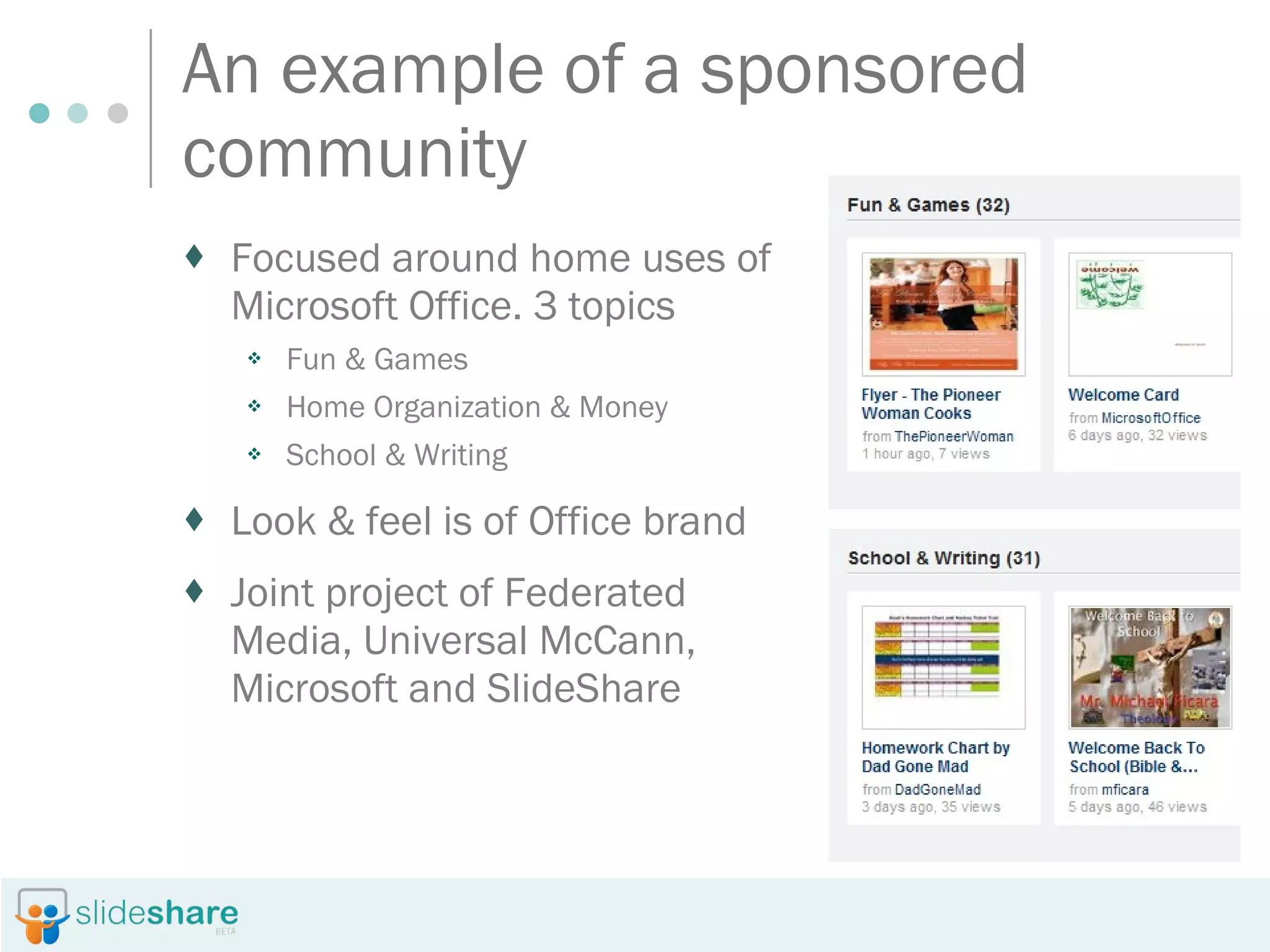 The document discusses the SlideShare Parent Toolbox Channel from Microsoft. It is a joint project between several companies to provide home and school content using Microsoft Office on the SlideShare platform. The channel aims to seamlessly integrate into the SlideShare community and take advantage of its virality. It will provide content for different levels of engagement through bloggers, templates, and tips. The goals are to encourage sharing, commenting, and interaction among users.