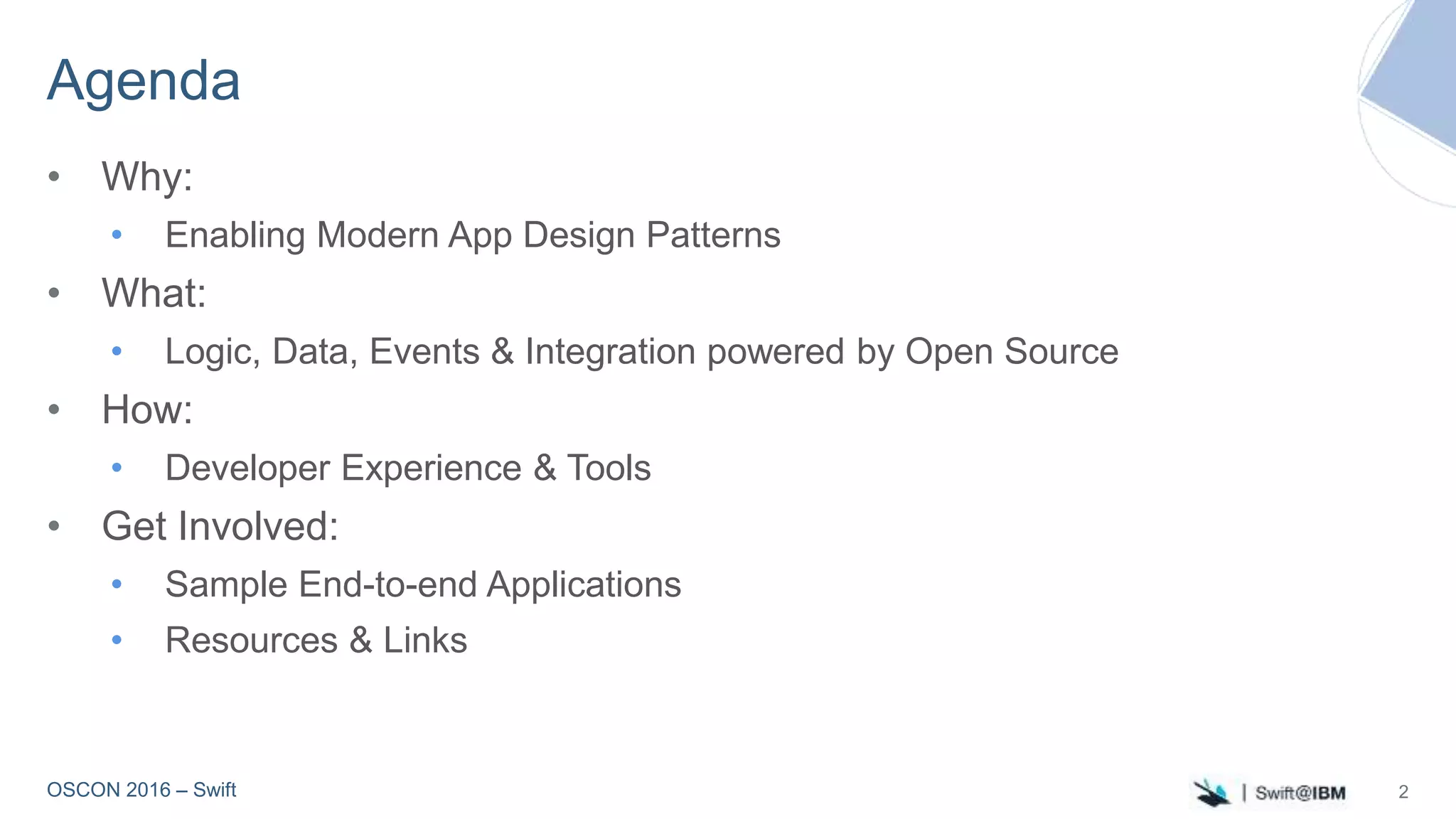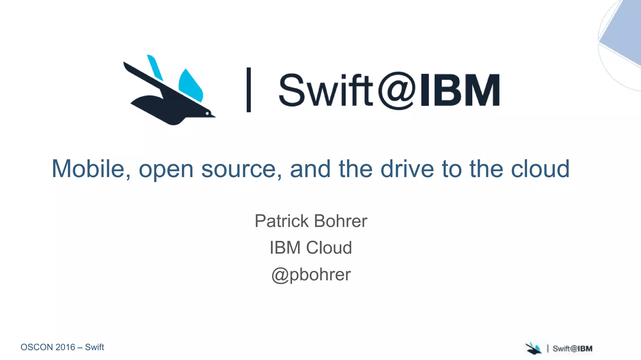 The document presents an overview of the Swift programming language's capabilities and its integration into application development, particularly focusing on cloud deployment and how it facilitates modern app design patterns. It outlines key features such as the Swift package manager, Kitura web framework, and various cloud technologies offered by IBM to support developers in creating and deploying applications. Additionally, it highlights community involvement, growth in Swift's popularity, and the potential for Swift on server-side applications.