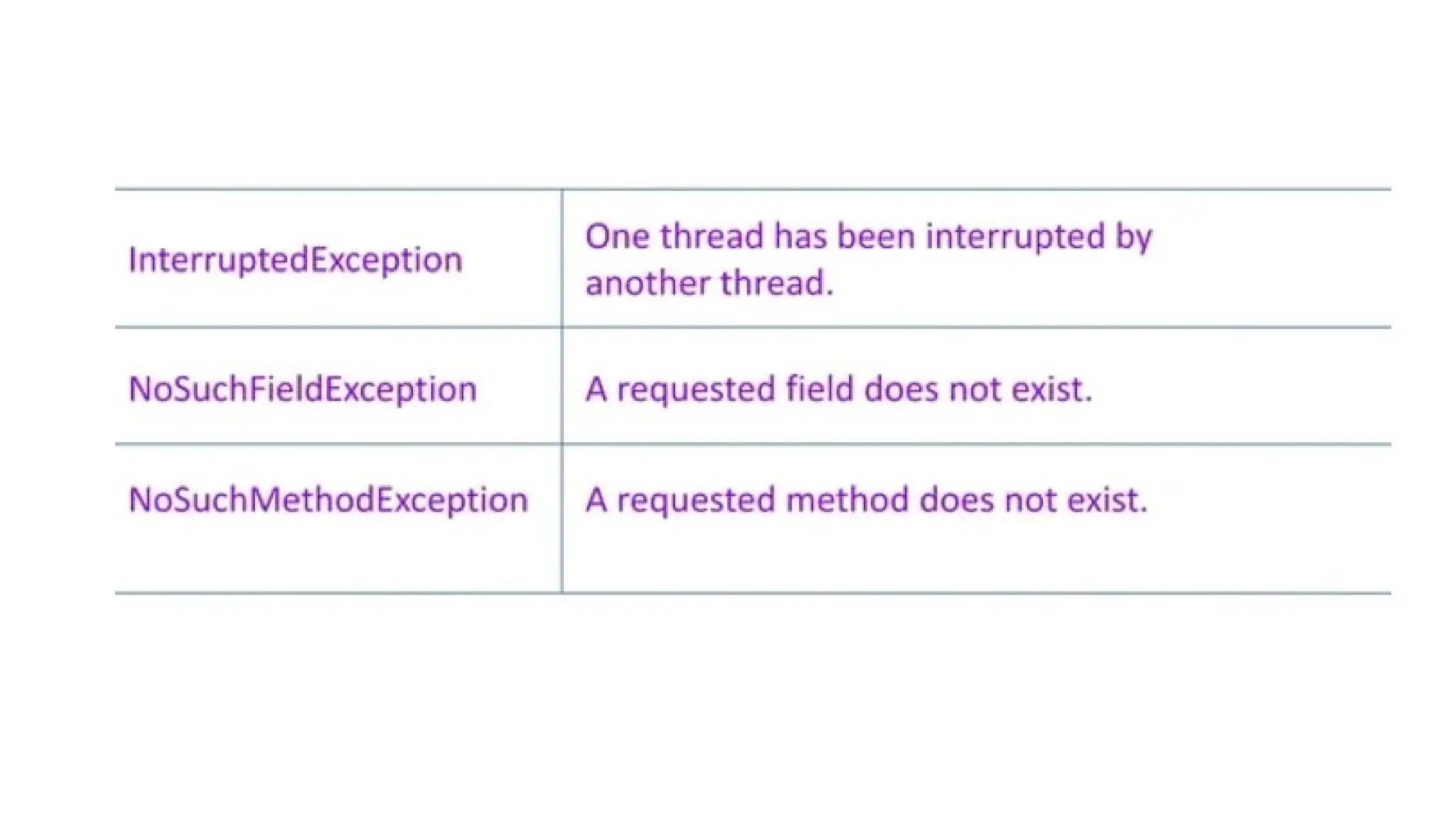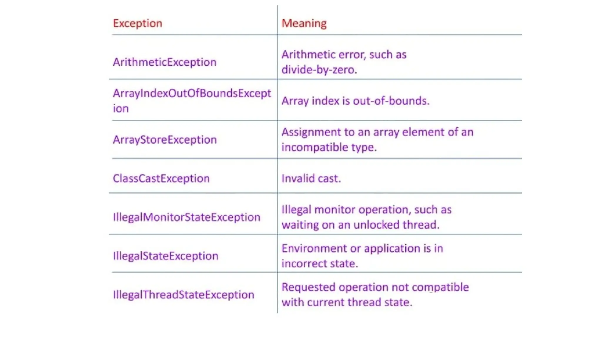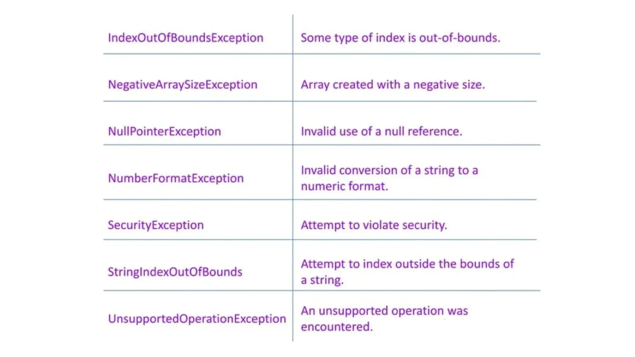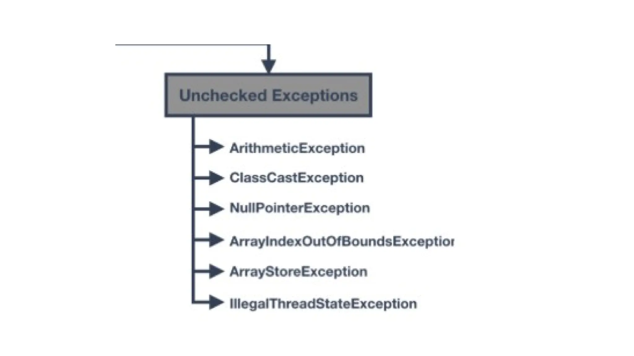 ● Unchecked exceptions → ArithmeticException, NullPointerException,