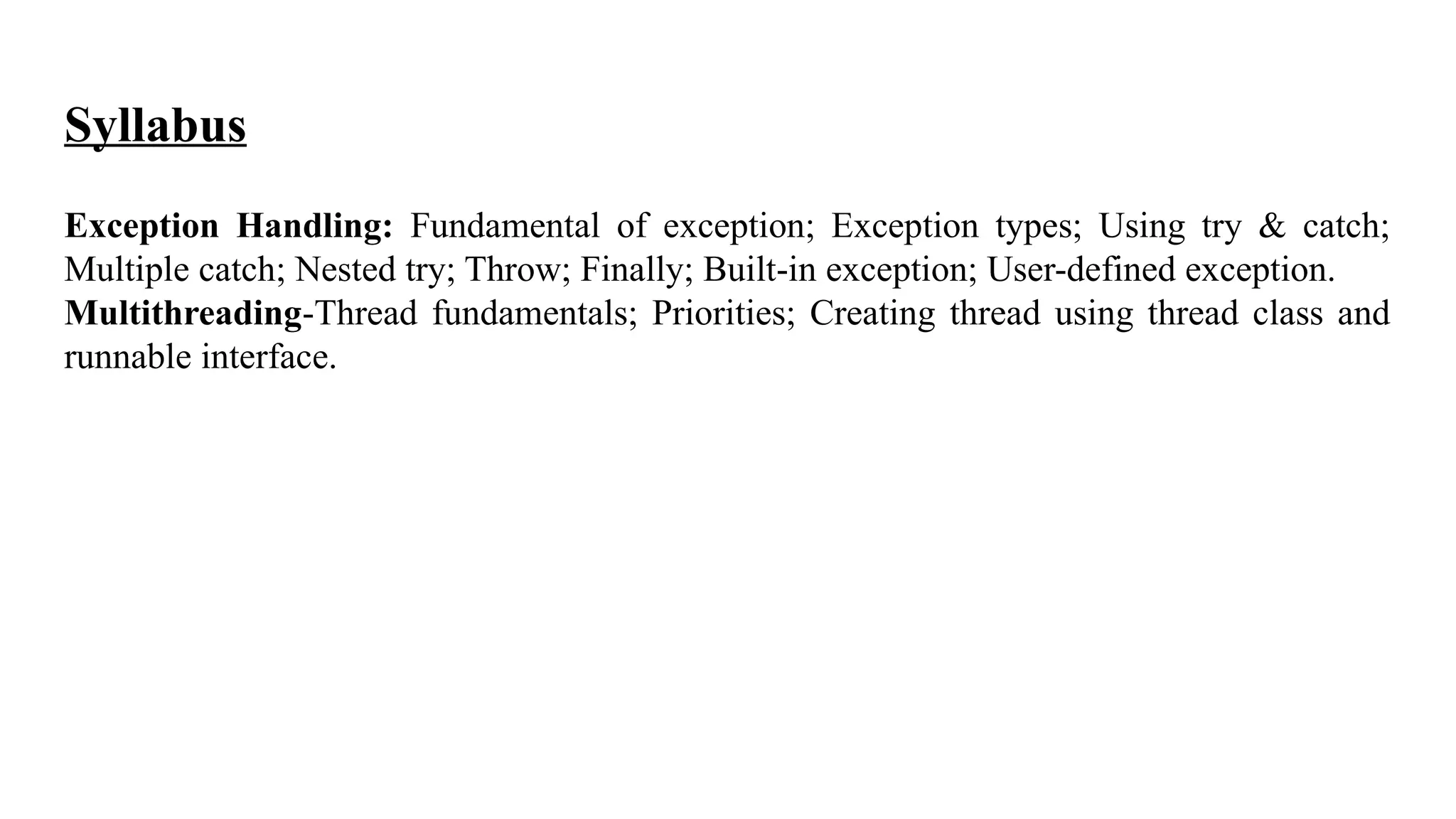 Exception Handling: Fundamentalof exception; Exception types; Using try & catch;