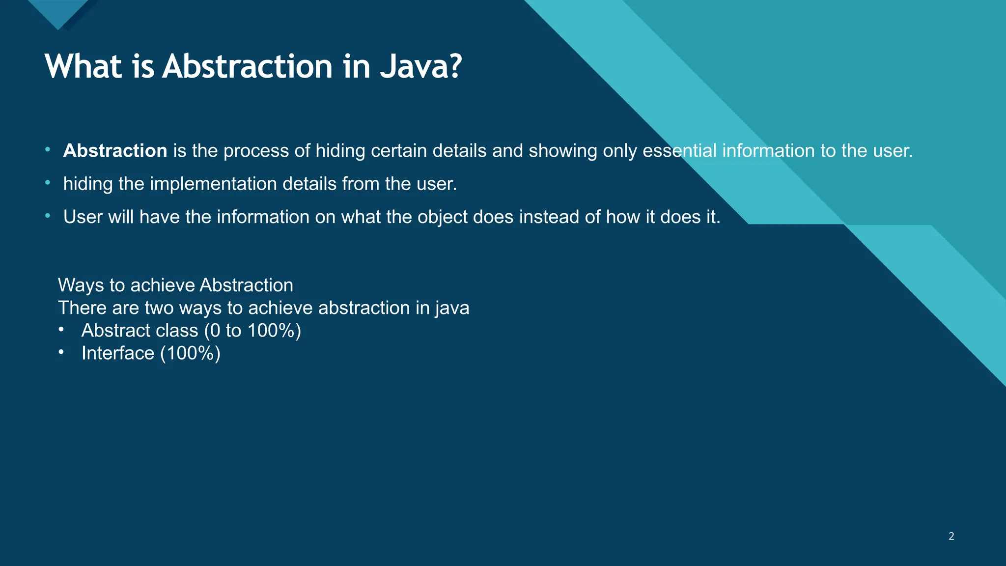 • Abstraction is the process of hiding certain details and showing only essential information to the user.