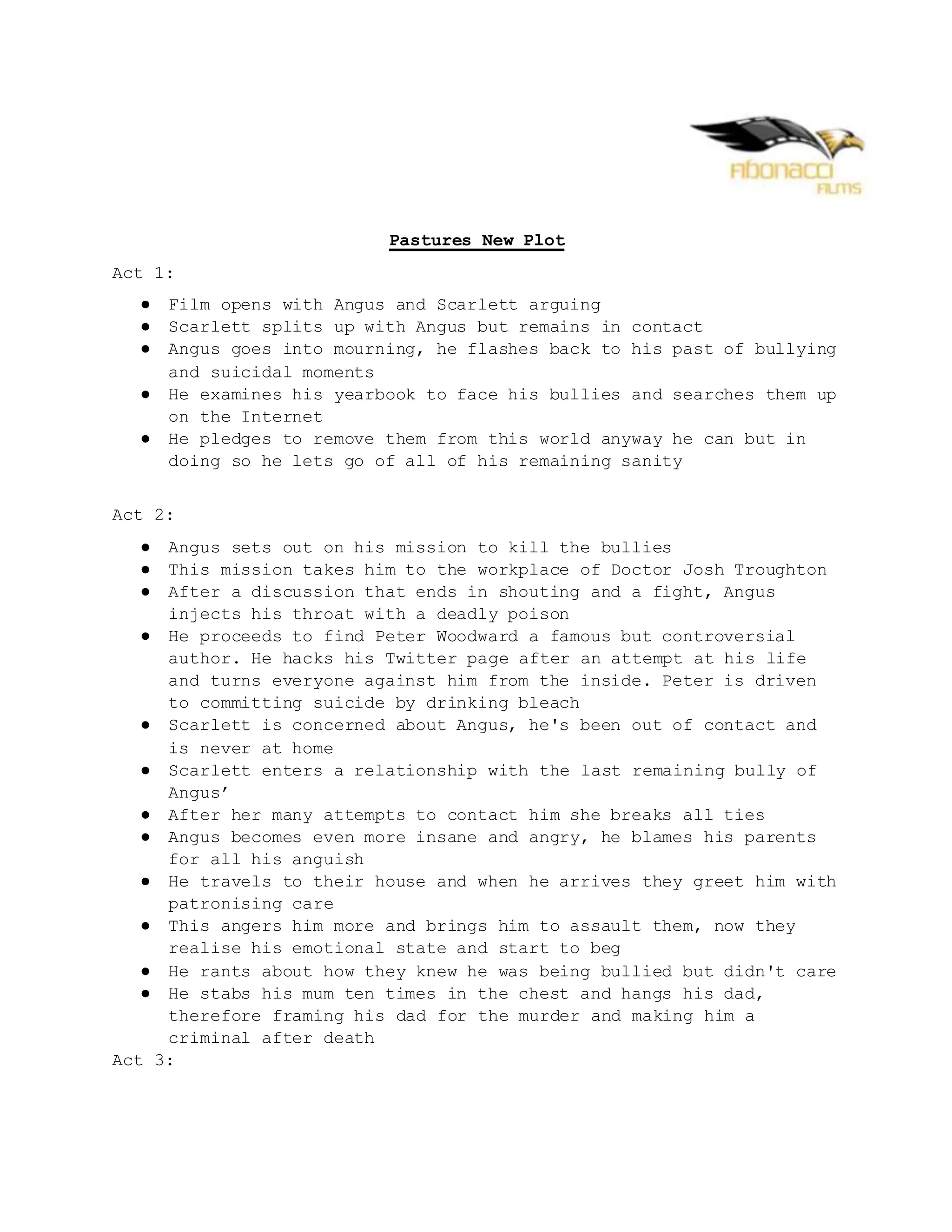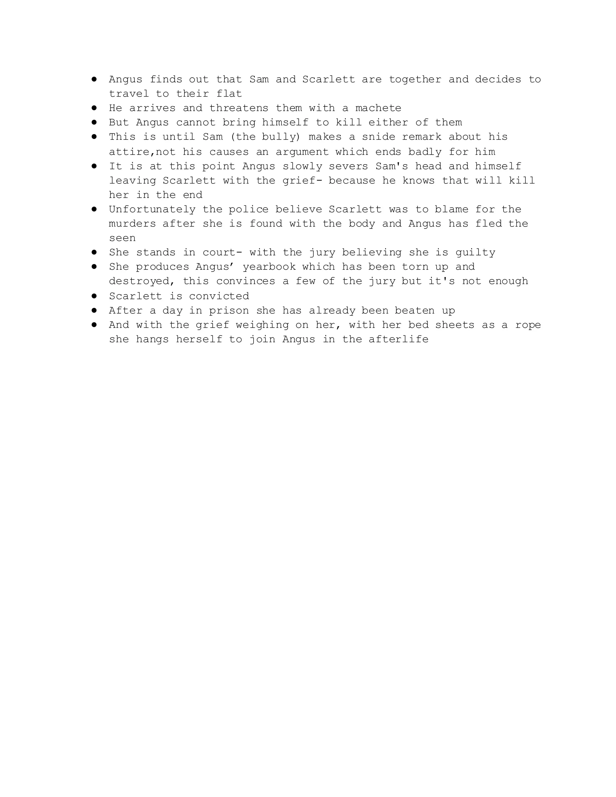 Angus goes on a killing spree to murder his childhood bullies after a mental breakdown following his breakup. He kills two bullies by poisoning one and driving the other to suicide. He then murders his parents when they don't acknowledge his bullying. Finally, he decapitates his last bully in front of his ex-girlfriend Scarlett, framing her for the murders before committing suicide. Scarlett is wrongly convicted and also takes her own life in prison.