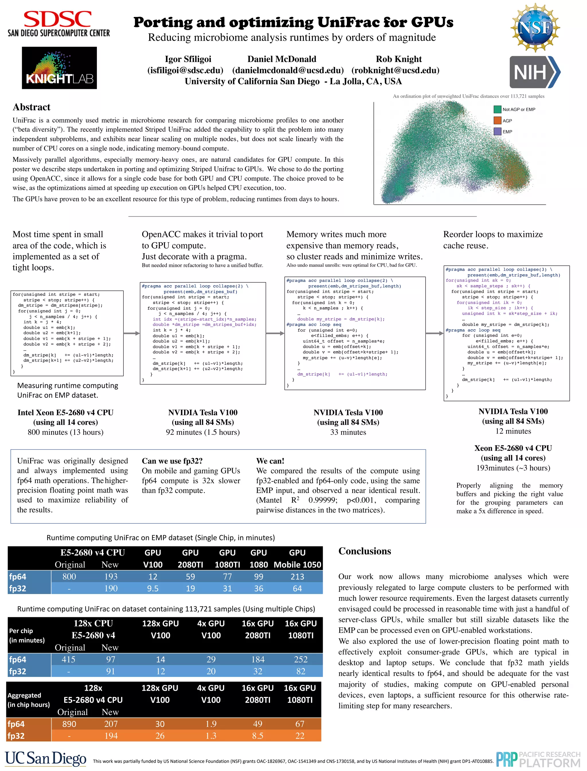 The document describes the porting and optimization of the Unifrac metric for use in GPU computing to significantly reduce microbiome analysis runtimes. By utilizing OpenACC, the researchers achieved speed improvements, enabling analyses previously constrained to large compute clusters to be conducted on fewer resources. The study also found that using lower-precision floating-point math (fp32) yielded nearly identical results to higher precision (fp64), making GPU-enabled personal devices viable for microbiome research.