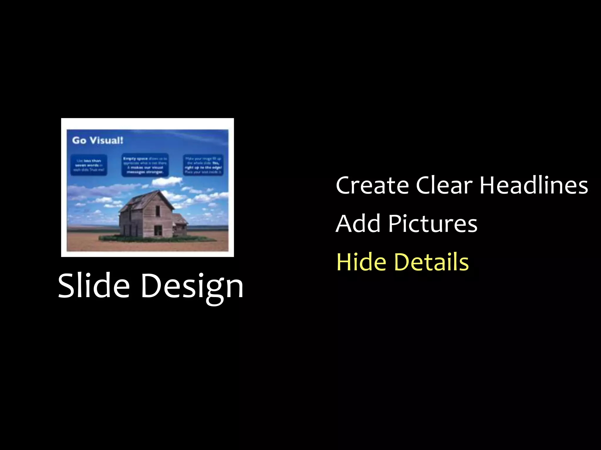 This document outlines effective slide design principles for presentations, emphasizing the importance of clear headlines, engaging visuals, and minimizing text to enhance audience retention and understanding. It critiques the misuse of PowerPoint, pointing out that poor design can hinder learning while advocating for good design practices. Key recommendations include using specific images, keeping content focused on the main idea, and providing details in speaker notes rather than on slides.