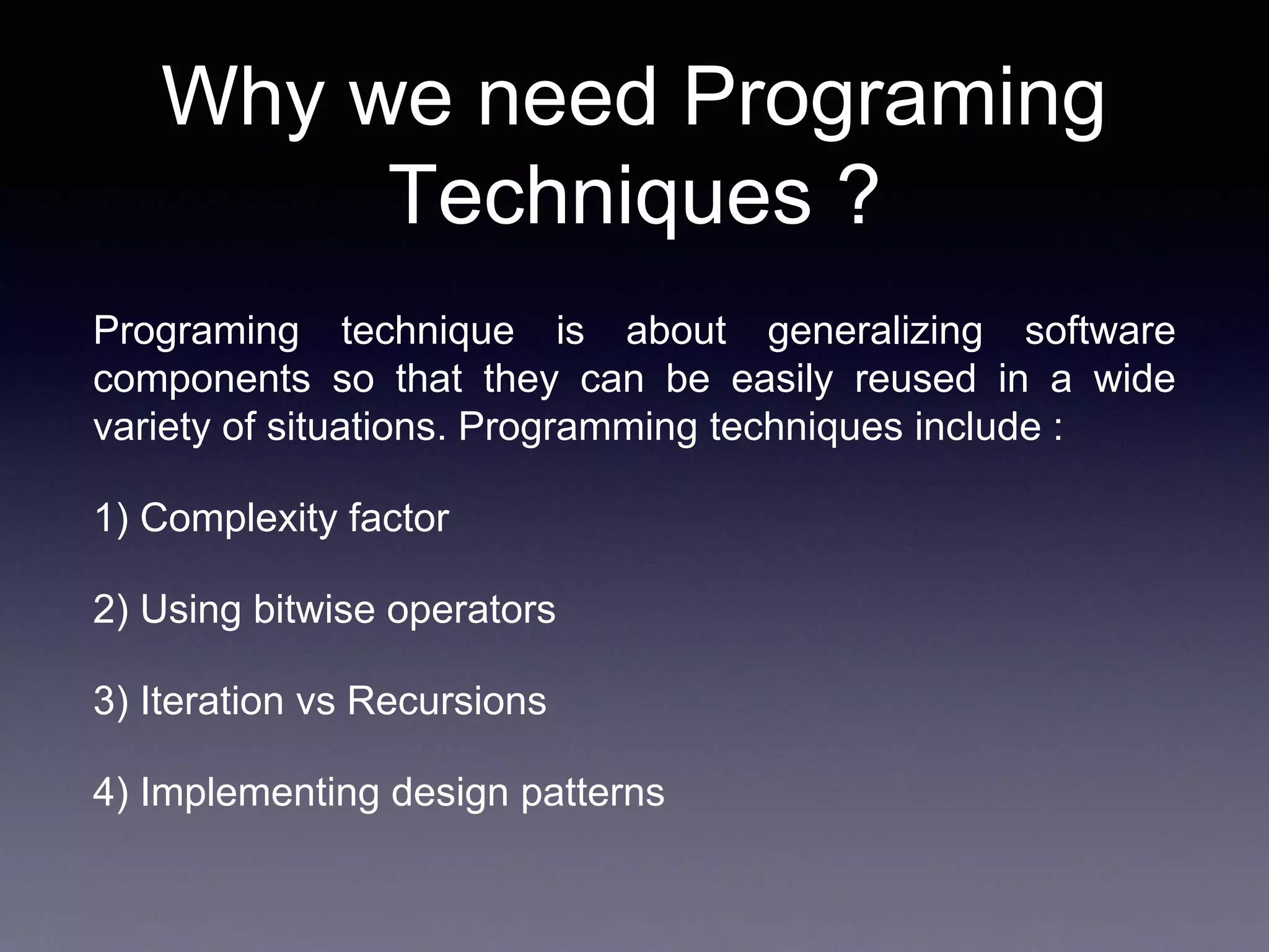 This document discusses various programming techniques. It begins by explaining why programming techniques are important for generalizing and reusing code. Some key techniques discussed include complexity factors, using bitwise operators, and the differences between iteration and recursion. The document then covers arrays, including their definition and advantages. It provides examples of reversing an array using different methods. Next, it delves into bitwise operators and provides examples of how they work. Finally, the document discusses design patterns and provides examples of common patterns like factory and singleton.