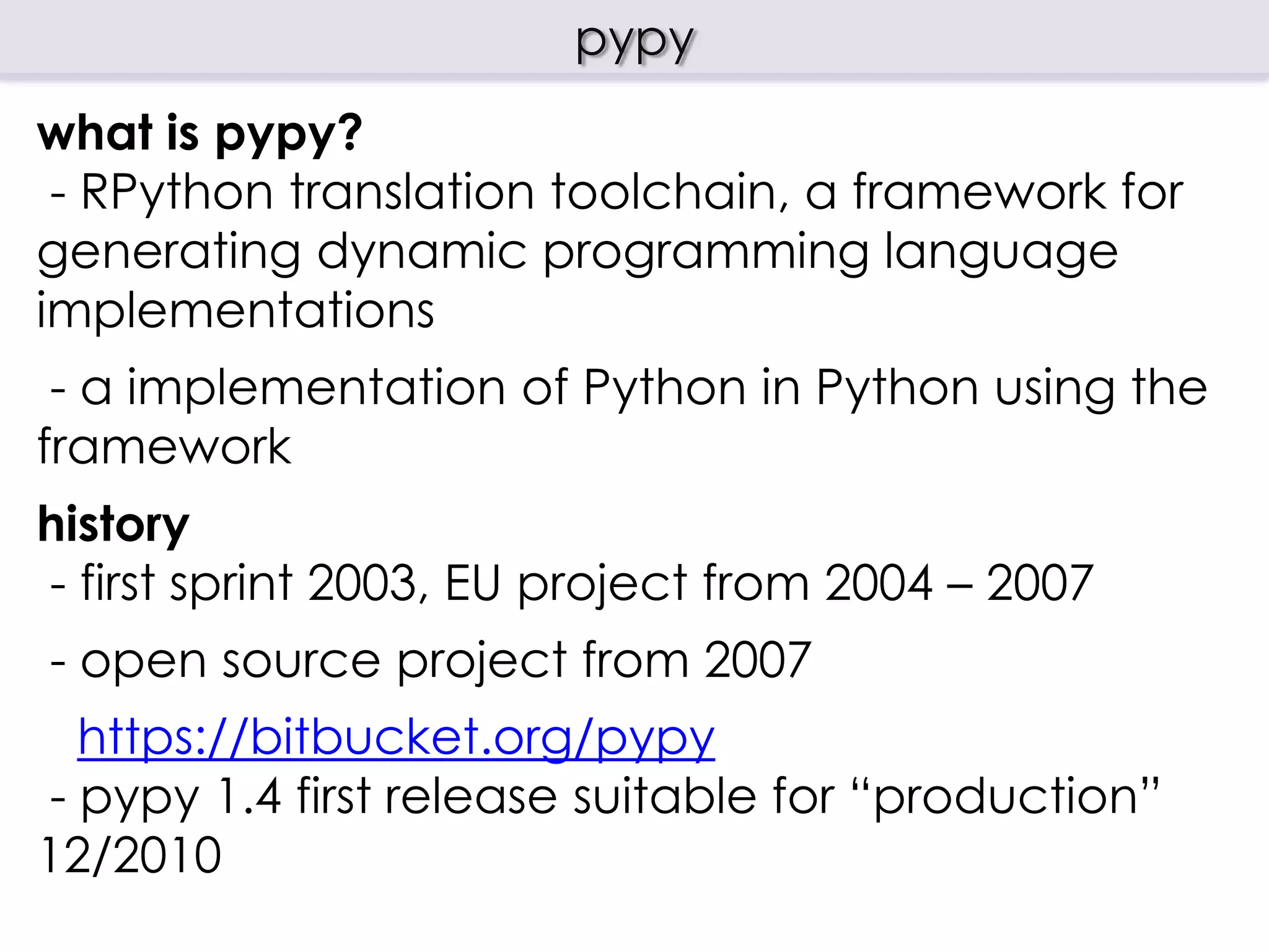 PyPy is an implementation of the Python language written in RPython, a restricted subset of Python. It includes a just-in-time compiler that can provide significant performance improvements over CPython for certain workloads. The author benchmarked several of their workflows and found that PyPy was 2-4x faster for some tasks like CSV to XML conversion, but up to 4x slower for others like simple CSV parsing. Overall, PyPy satisfies most criteria for production readiness and supports the key Python modules used by the author's projects, making it a viable alternative to CPython for improving performance.