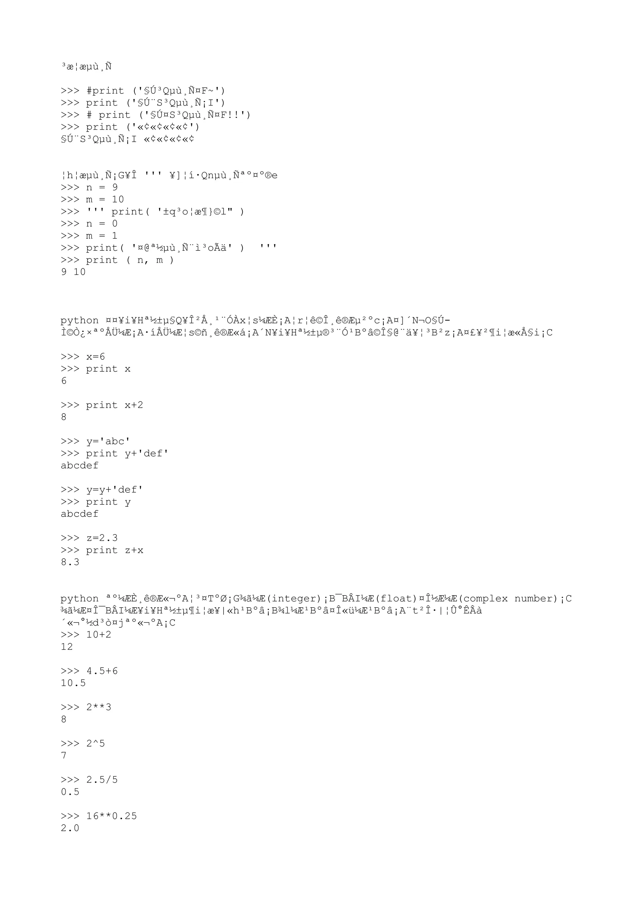 This document provides examples of using Python code to demonstrate basic Python syntax and functionality. It shows how to define variables, perform arithmetic operations and print output with different data types including integers, floats, strings, lists, and complex numbers. It also demonstrates indexing, slicing and modifying list elements as well as built-in functions like len(), int(), float(), round() and str().