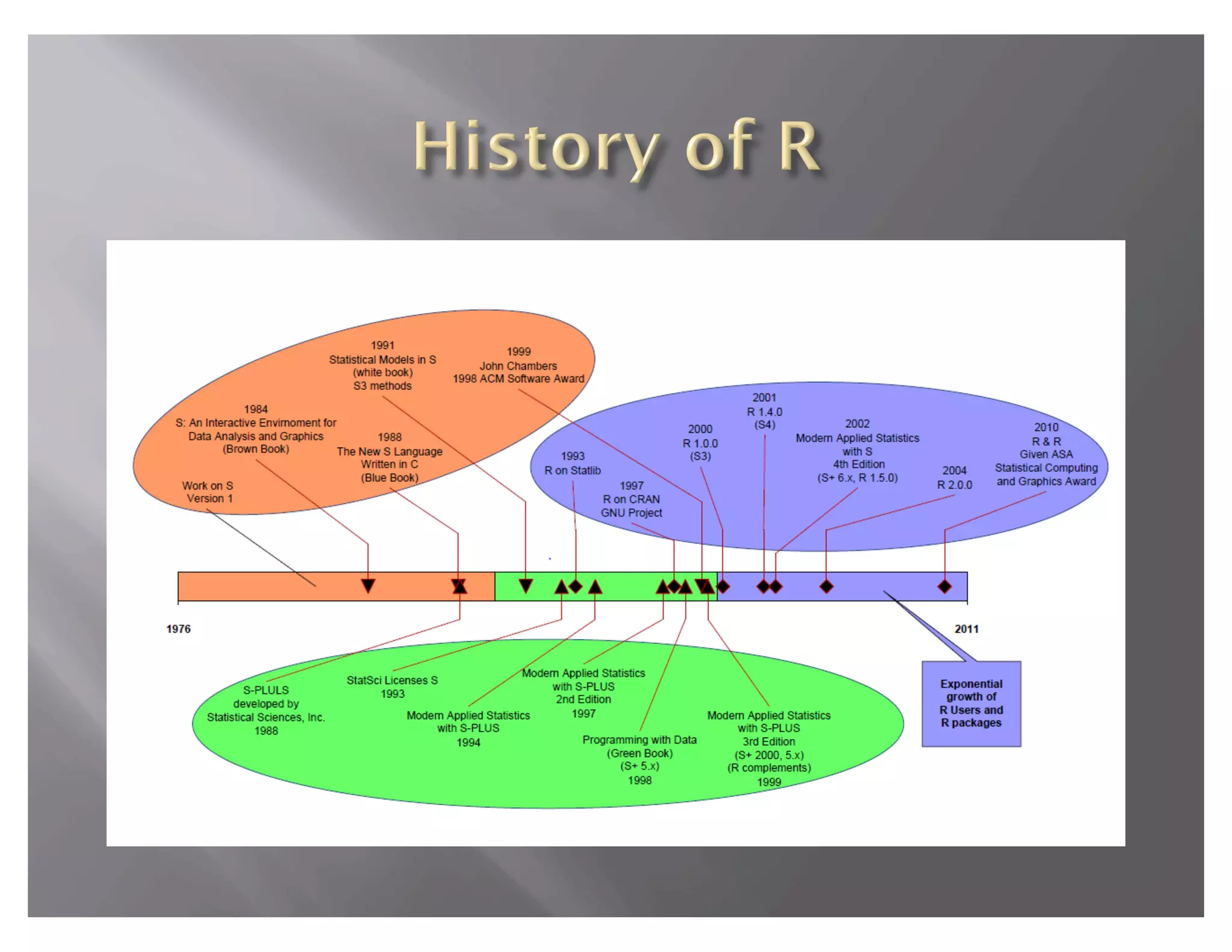 R is an open source statistical programming language and environment created in 1993 that is popular for statistical analysis and graphics. It was developed as an implementation of S and is cited as the most powerful statistical computing language. R is widely used at companies like Google and allows interfacing with other programs through servers to enable analysis, graphing, and other statistical tasks. R can be used through its basic environment, commercial products like RStudio, or plugins for other IDEs.