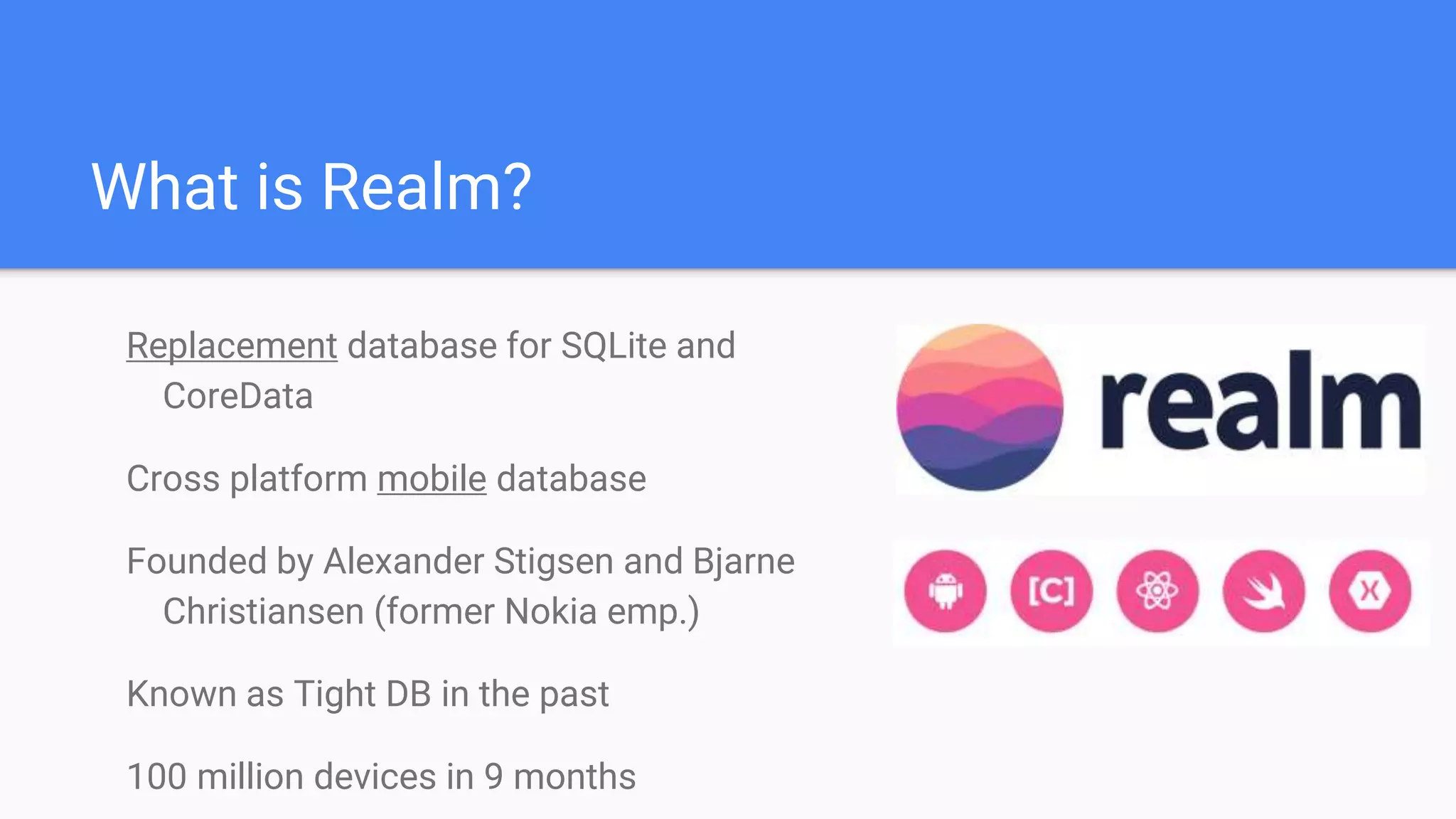 Realm is a replacement for SQLite and CoreData databases that allows for faster access and easier object mapping. It is a cross-platform mobile database that can provide up to 10x faster performance than raw SQLite. Realm uses a simple object-oriented model and allows for complex queries and relationships between objects. It also supports asynchronous access and notifications when data changes.