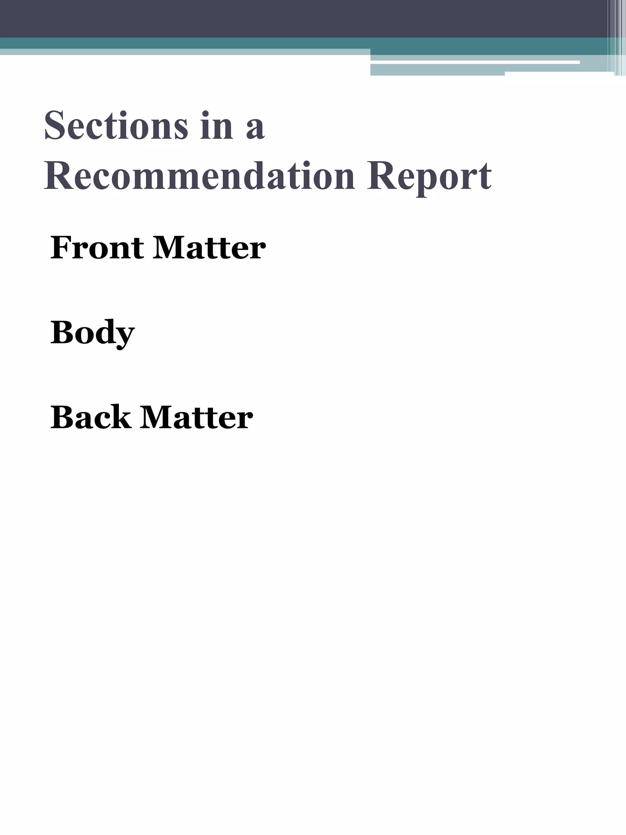 This document discusses the typical sections included in the front matter of a recommendation report. The front matter usually includes elements like a transmittal letter, cover page, title page, abstract, executive summary, table of contents, and list of illustrations. The transmittal letter explains the purpose and content of the report. The abstract provides a condensed overview of the major points covered in the report. The executive summary reviews the essential points and allows the reader to decide if they need to read the full report.