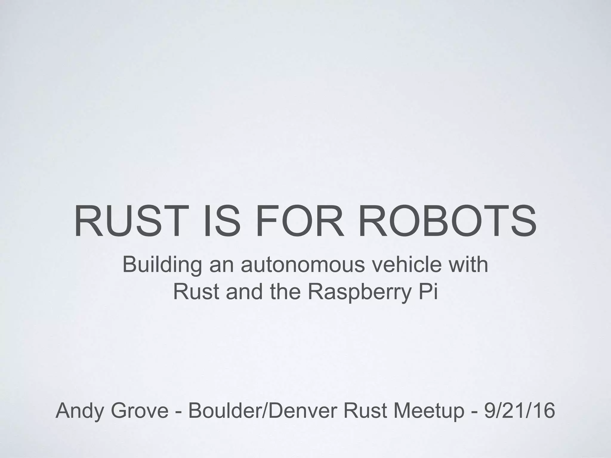 This document discusses a project to build an autonomous vehicle using Rust and a Raspberry Pi. The objectives were to navigate to GPS waypoints, avoid obstacles using ultrasonic sensors, and record video. Rust was chosen for its performance, safety, and existing crates for hardware interfaces. Challenges included slow compilation on the Pi and lack of sensor libraries in Rust. The vehicle struggled detecting obstacles at angles and had compass calibration issues. Overall it was a learning experience to use Rust on embedded systems.