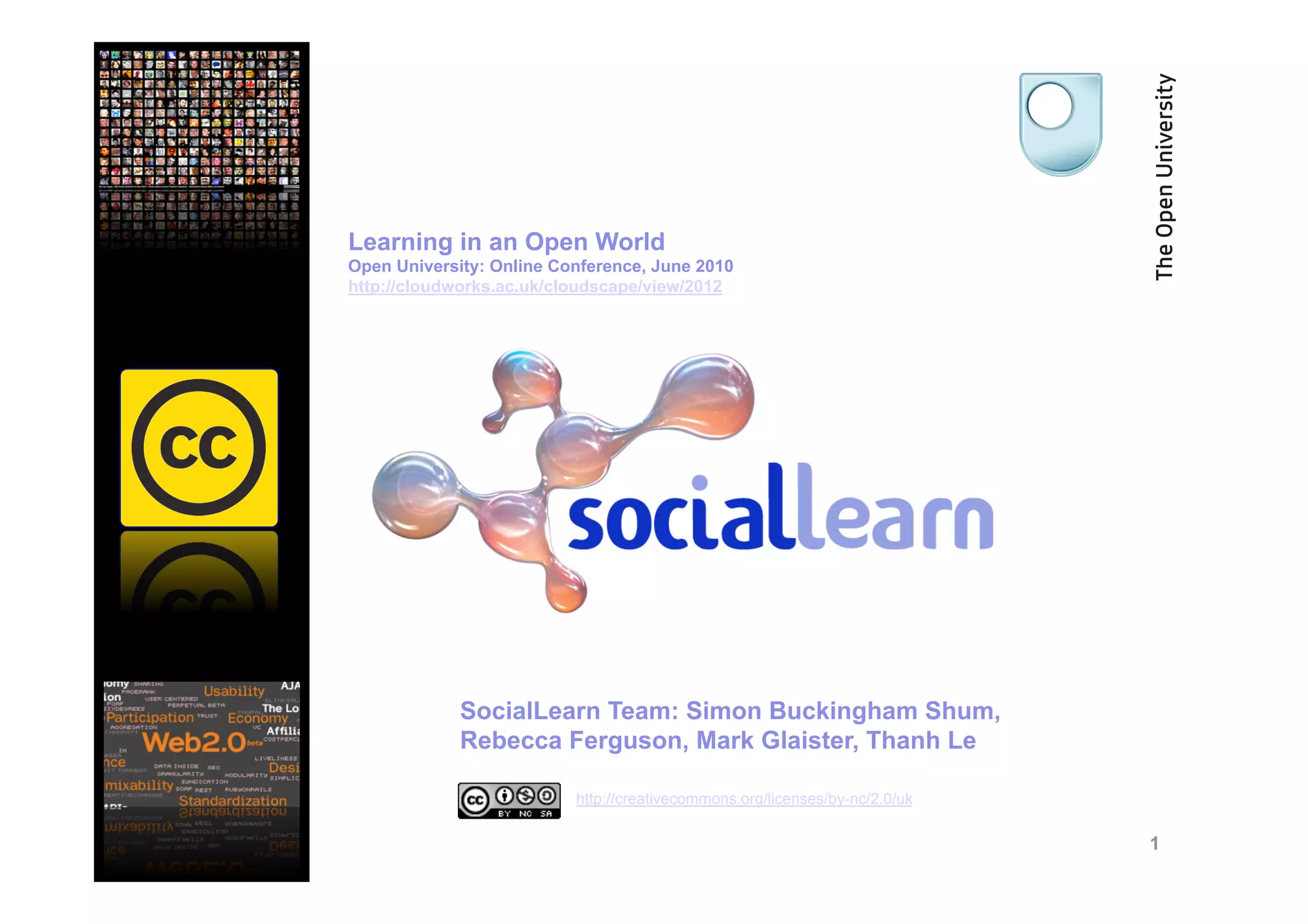 The document discusses the developments and future perspectives of social learning within an online educational context, particularly focusing on the Open University and its initiatives around Open Educational Resources (OER). It highlights the integration of various social applications and tools aimed at enhancing collaboration and resource sharing among learners. Additionally, it outlines the potential of recommendation engines and the use of technology to improve learner engagement and connectivity.