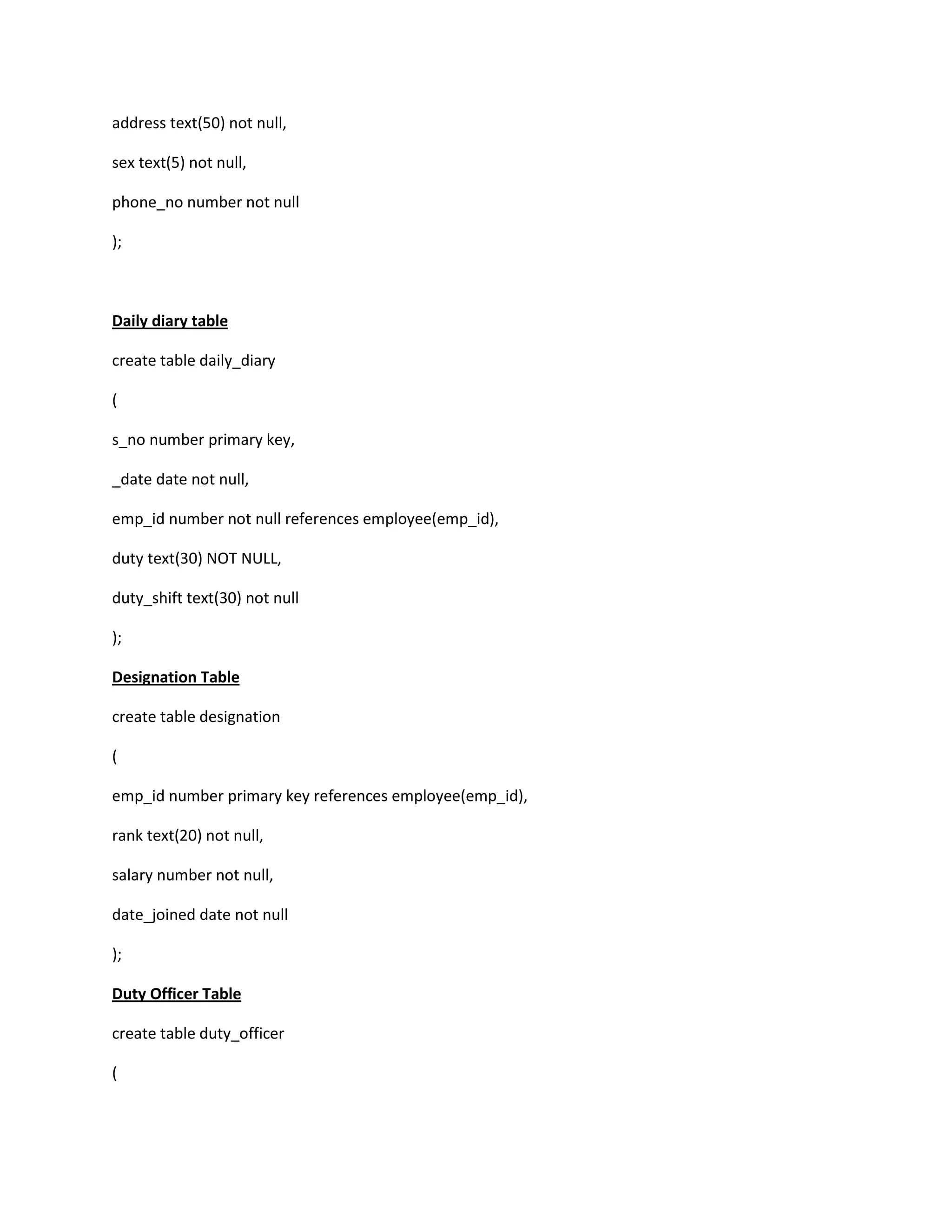 The document contains SQL commands to create tables for a police database including tables for cases, employees, FIRs, daily diary entries, designations, and more. It also includes sample INSERT statements to add data to these tables, and some example SELECT queries to retrieve data from the tables.