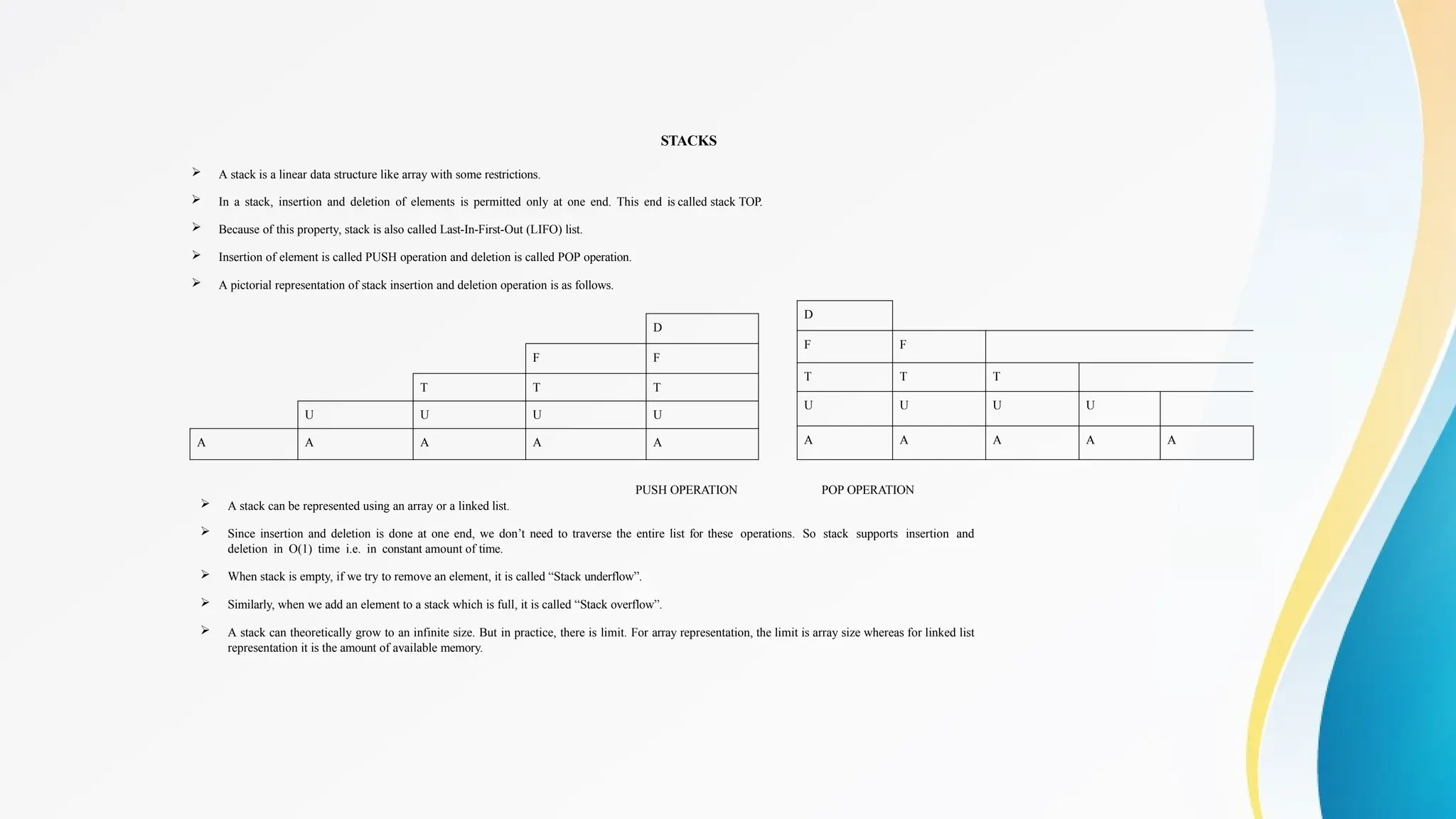 Since insertion and deletion is done at one end, we don’t need to traverse the entire list for these operations. So stack supports insertion and