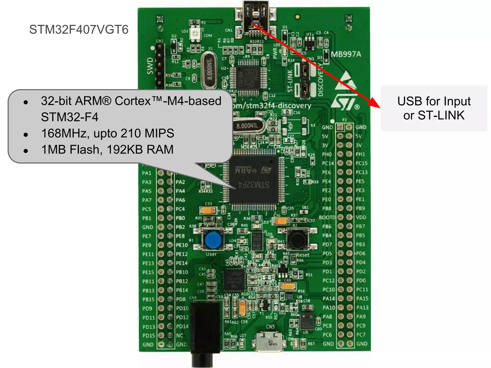 The document discusses using an STM32F407VGT6 microcontroller with 168MHz Cortex-M4 CPU, 1MB flash, and 192KB RAM. It provides instructions for downloading toolchains, firmware, and debugging software to interface with the microcontroller via an onboard ST-LINK/V2 debugger over USB or JTAG. The STM32F4 Discovery board is highlighted as a development platform for experimenting with the microcontroller.