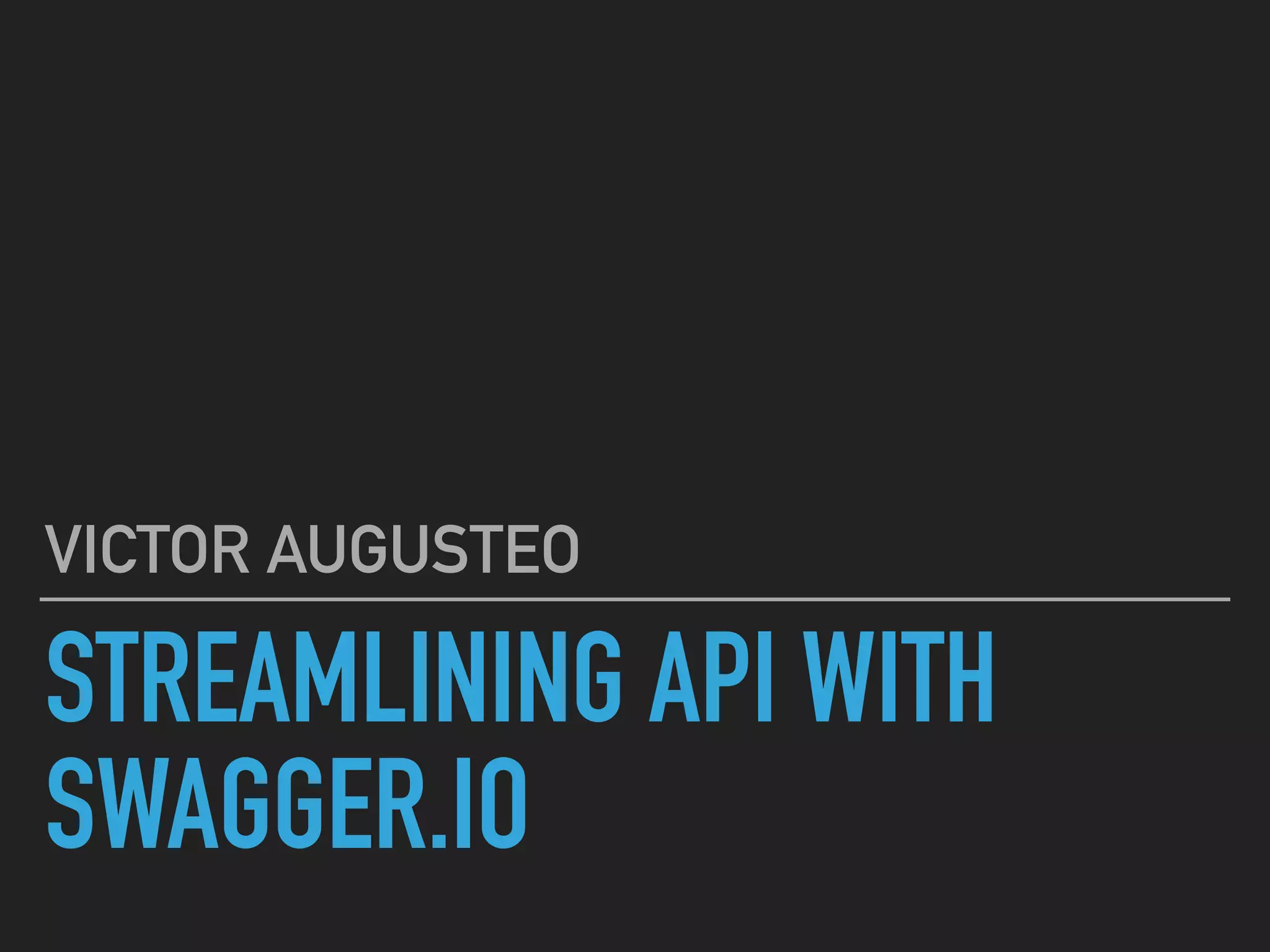 Victor Augusteo gives a presentation on streamlining APIs with Swagger.io. He introduces Swagger and its components for code generation, UI documentation, and editing OpenAPI specification files. Swagger can standardize API development by generating server and client code from specifications. It provides a single source of truth and makes communication between frontend and backend engineers more effective. He demonstrates locally running Swagger Editor to create an API spec and generate a Ruby server stub and Swift client code.