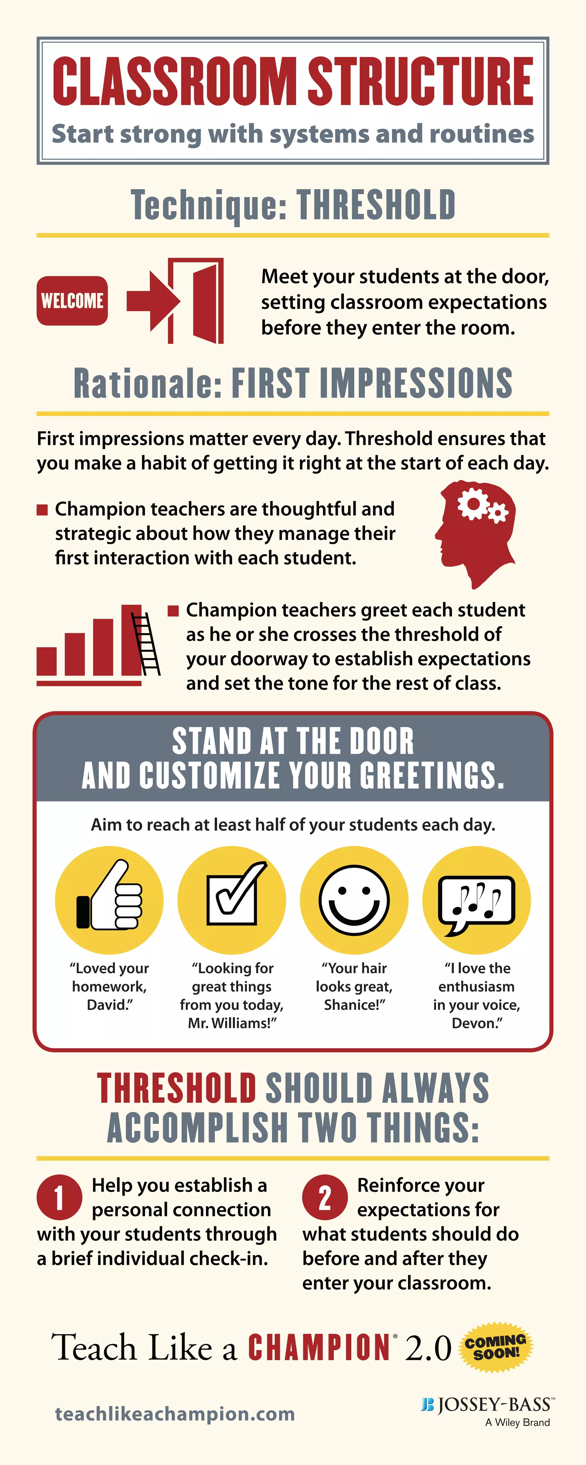 The document emphasizes the importance of establishing a strong classroom structure through personalized greetings as students enter. It highlights the technique of meeting students at the threshold to create personal connections and reinforce expectations. Champion teachers strategically use this first interaction to set a positive tone for the day.