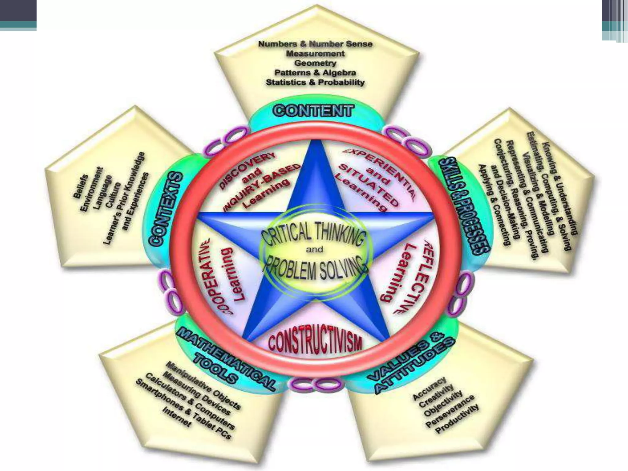 This document outlines a teaching and learning framework for mathematics education. It discusses important skills like critical thinking and problem solving. It also covers key content areas and processes to develop, like numbers, measurement, geometry, and representing and communicating. Principles for both teaching and learning mathematics are provided, such as the need for active engagement and using a variety of tools. Learning theories like constructivism, cooperative learning, and discovery-based learning are also referenced. Examples of experiential and reflective learning activities are given to help students learn mathematics concepts through real-world experiences and reflection.