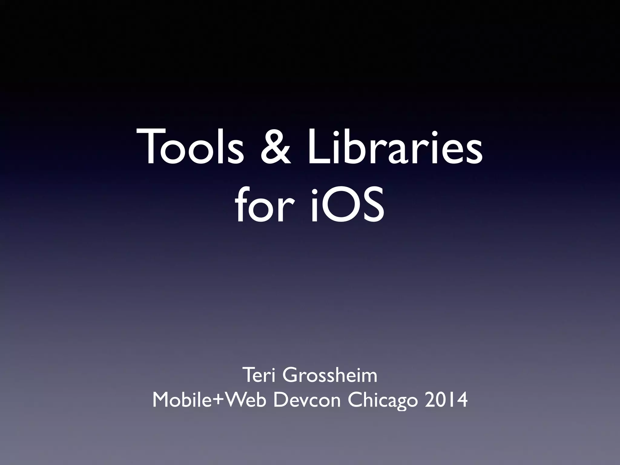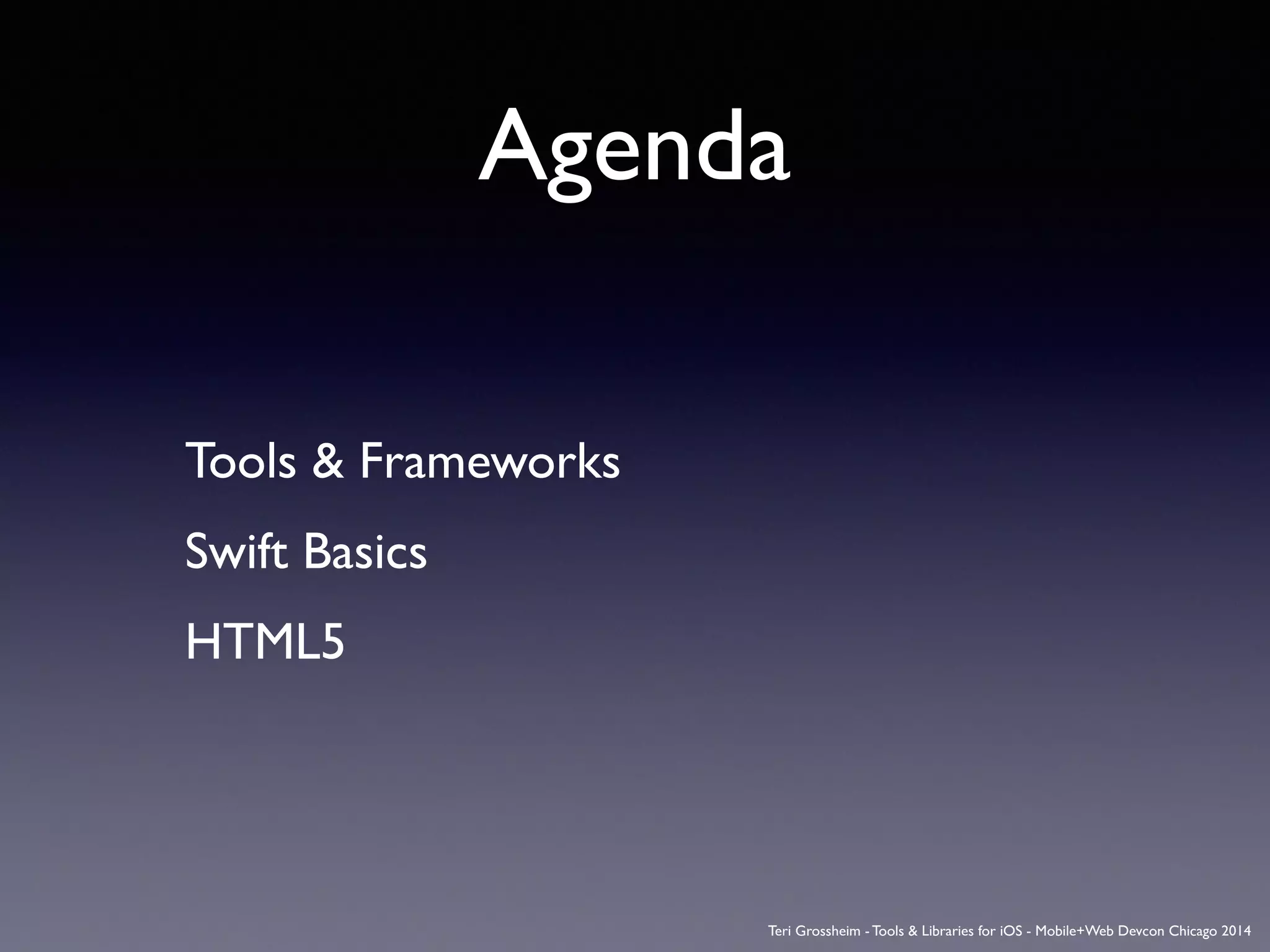The document presents an overview of tools and libraries for iOS development, as discussed by Teri Grossheim at the Mobile+Web DevCon in Chicago 2014. It includes information on Apple Developer Programs, Xcode, the Swift programming language, and various iOS SDK frameworks and functionalities. The session also covers key technologies in Cocoa Touch and Core Services, along with references for further learning.