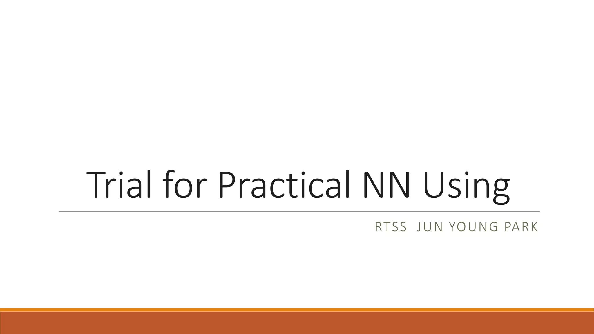 The document discusses trialing practical neural networks using transfer learning. It preprocesses a dataset with 3 classes of images and divides it for training and validation. Several models are fine-tuned on the data, with accuracy ranging from 86% to 95%. Issues addressed include the small amount of training data per class and need for hyperparameter tuning to improve performance.