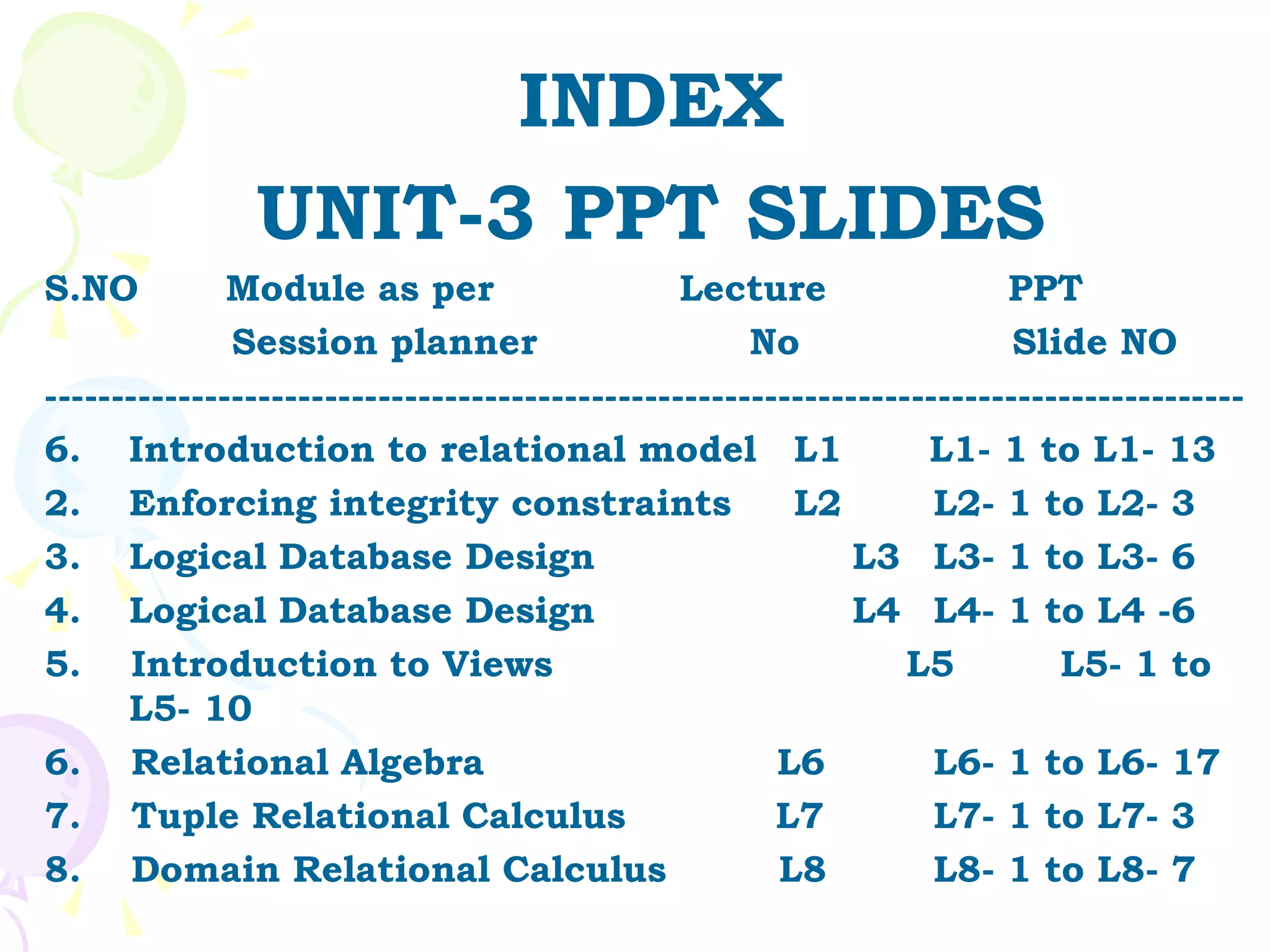 - Logical database design including mapping ER diagrams to relations, key constraints, participation constraints, and handling weak entities.