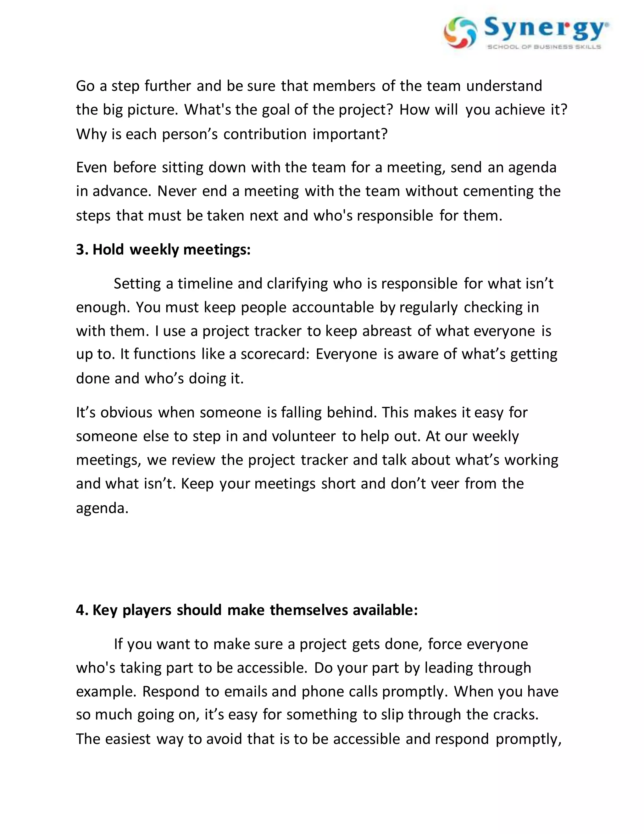 This document discusses reasons why some projects succeed while others fail and provides recommendations to help ensure project success. It recommends that to successfully complete a project, one should set a timeline with realistic deadlines, get all team members on the same page by clarifying expectations and responsibilities, hold weekly meetings to check progress and keep people accountable, make key players available to respond promptly, and promote transparency by keeping all members informed.