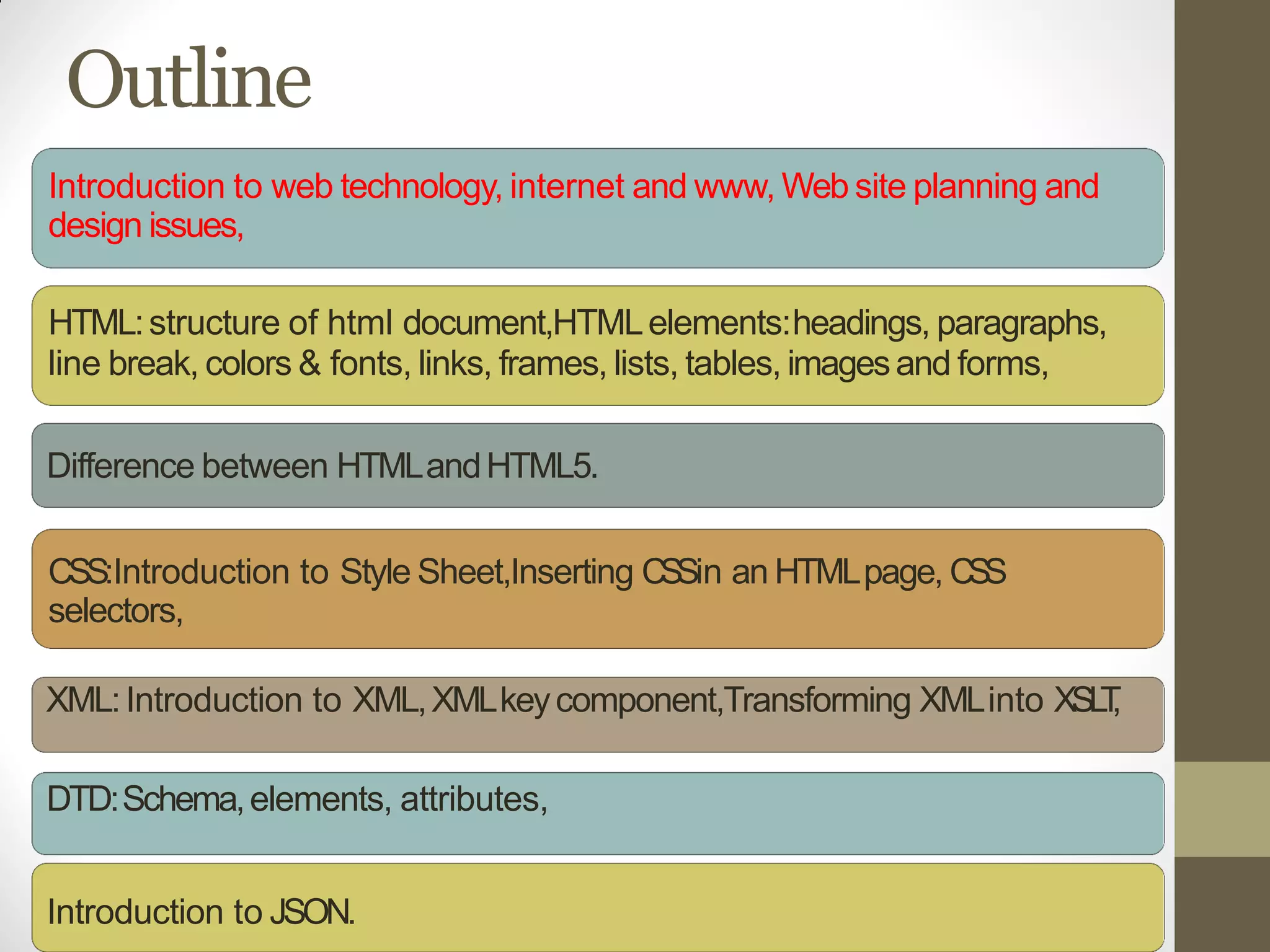 The document outlines topics related to web development including introductions to HTML, CSS, XML, JSON, and other web technologies. It discusses internet infrastructure, the world wide web, and how websites are planned and designed. The document also provides an outline and overview of key elements of HTML like headings, paragraphs, colors, fonts, links, and images.