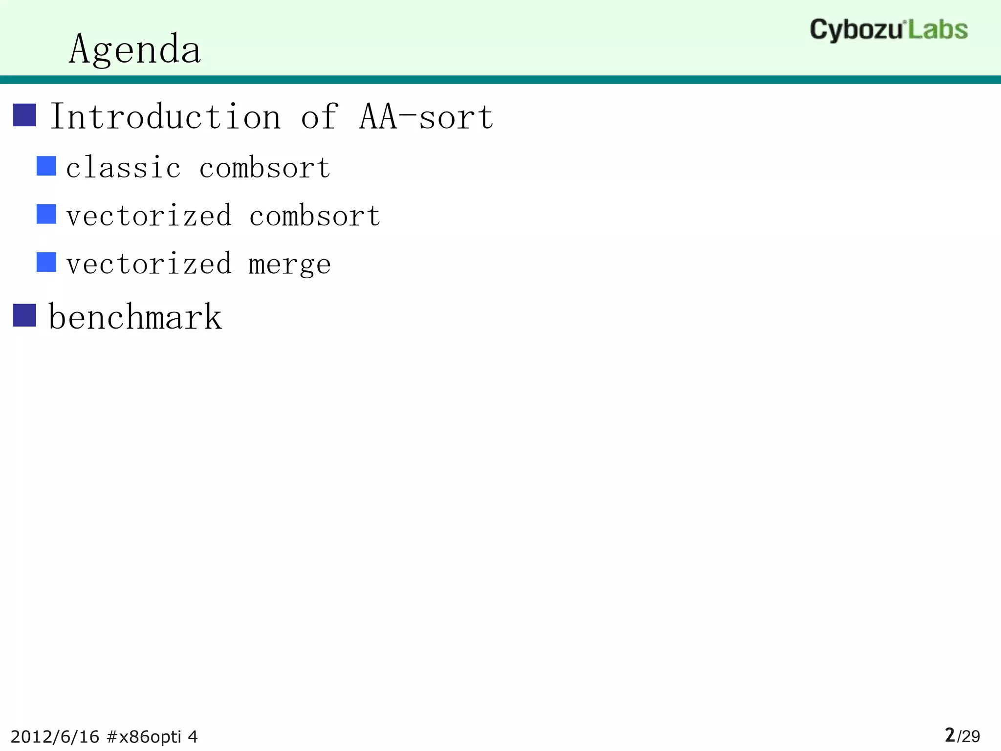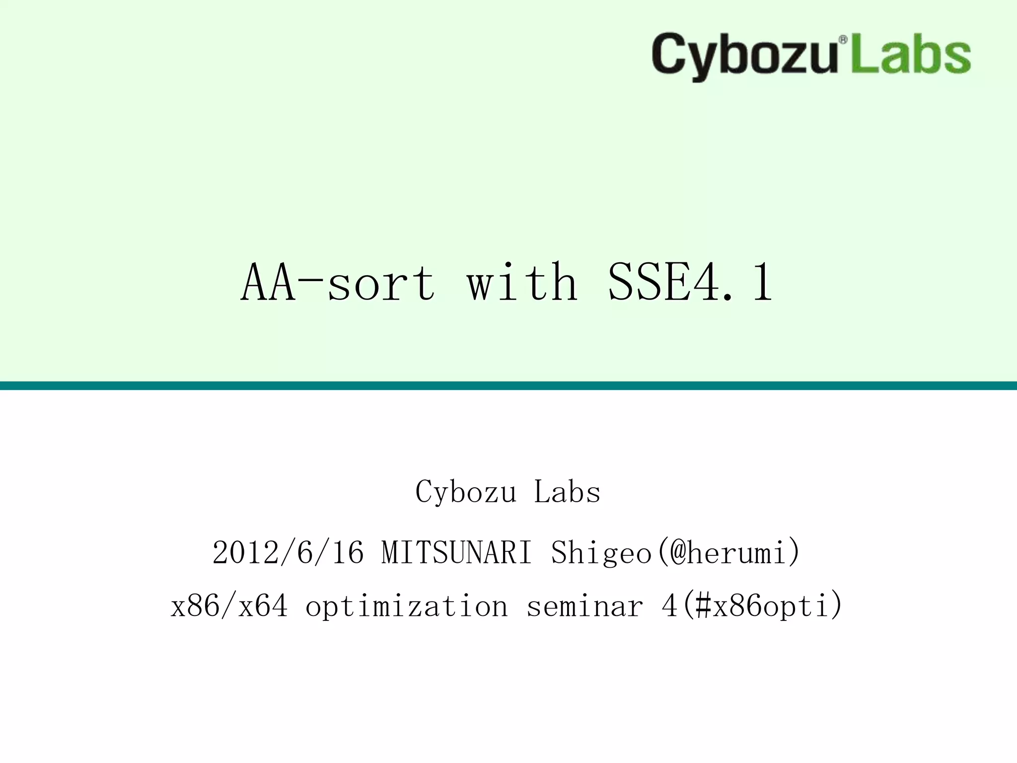 The document summarizes AA-sort, a sorting algorithm optimized for SIMD and multicore processors. AA-sort works by first sorting blocks of data in parallel using vectorized combsort. It then merges the sorted blocks together. Key steps include sorting 4 elements within each SIMD register, transposing the registers, and performing a vectorized version of combsort without conditional branches. The document provides pseudocode for these steps.