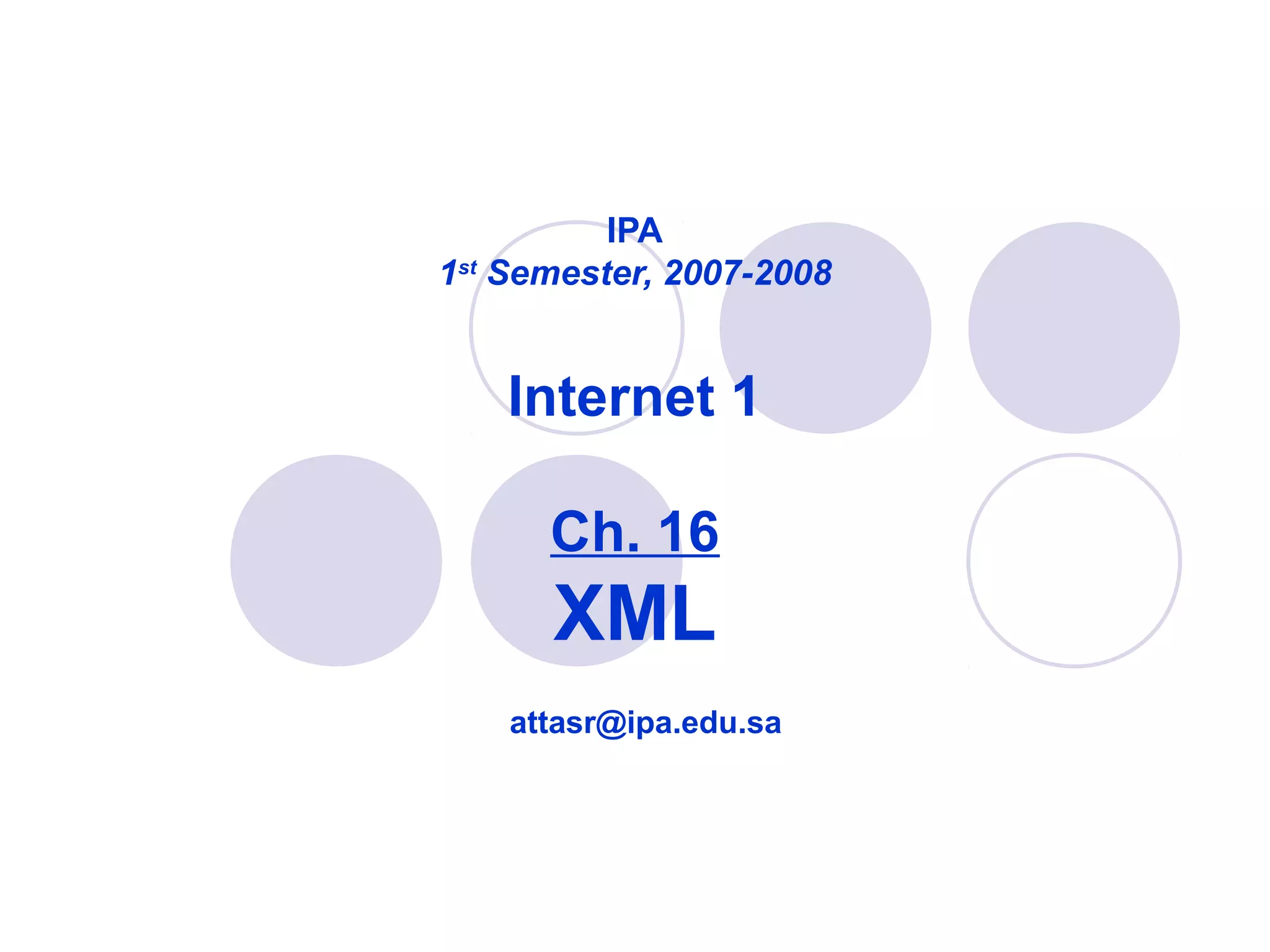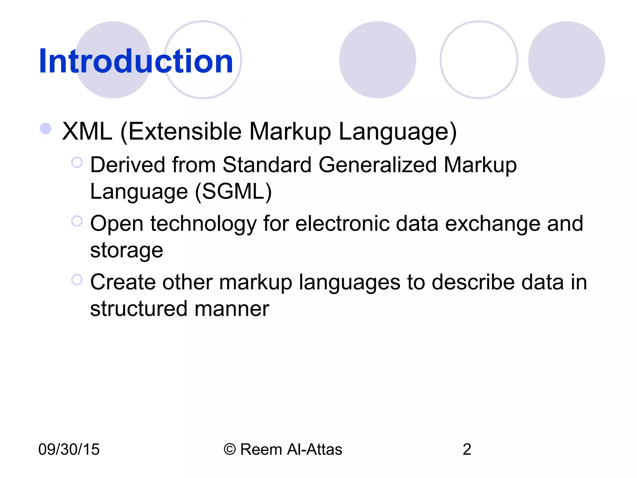 This document provides an introduction to XML (Extensible Markup Language). XML is derived from SGML and allows users to create structured data formats and share information. The document discusses XML documents, parsers, and document type definitions (DTDs). It also introduces XML schemas, namespaces, and common XML vocabularies used to describe different types of data like math expressions and vector graphics.