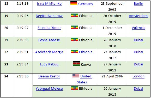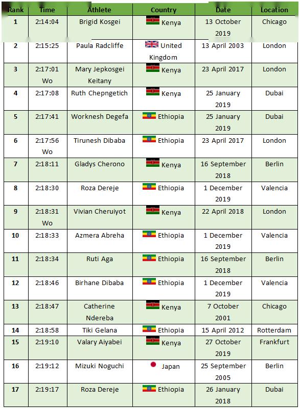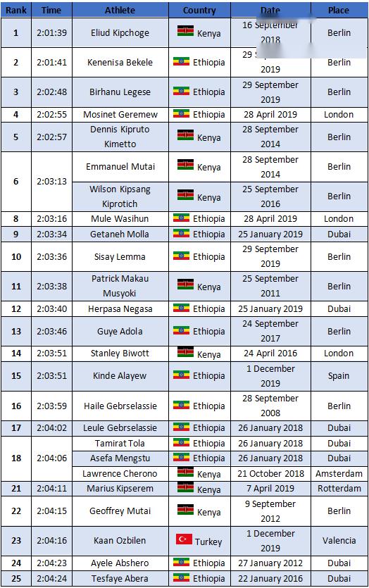 世界男子和女子马拉松成绩最好的运动员TOP25数据来源于维基百科