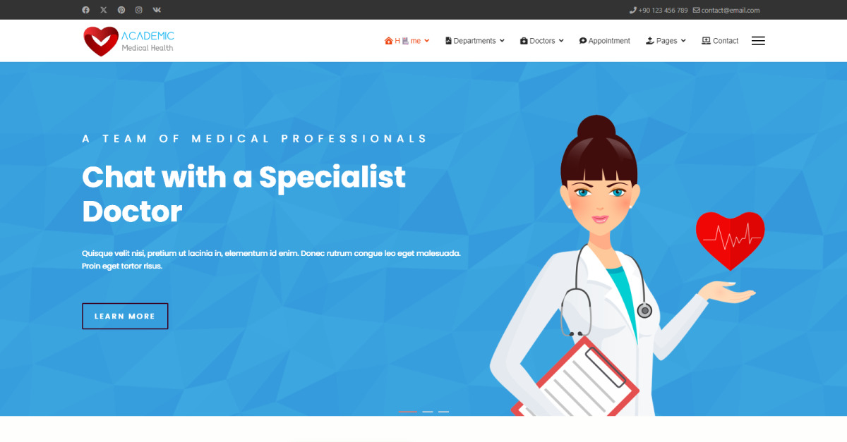 您可以通过我们简单、易于使用且易于理解的主题来展示介绍您的医院、诊所和实验室的视频和文章...您还可以向患者展示您的私人诊所或办公区域的照片。在我们的主题中,您可以分享特定于您的医生的培训、研讨会、工作经历、专业领域、服务和实践的内容。