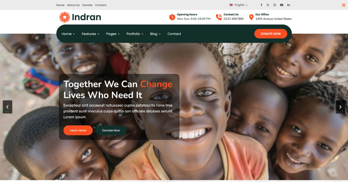 Indran 非营利慈善机构 Joomla 模板 Indran 是一款现代化且功能明确的 Joomla 模板,专为非营利组织、慈善机构和筹款组织设计。它基于强大的 T4 框架和 Bootstrap 5 构建,提供全面的响应能力、快速的性能和灵活的布局选项,让您轻松分享您的使命、联系捐赠者并激励行动。