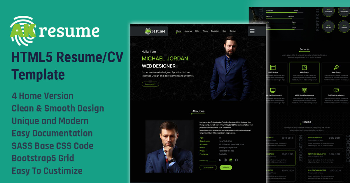 AKresume是一个专业的响应式作品集模板。 Responsive 基于 Twitter Bootstrap 5,是一款适合设计师、开发人员、自由职业者、摄影师、平面设计师、企业、医生和教师的出色设计理念模板。