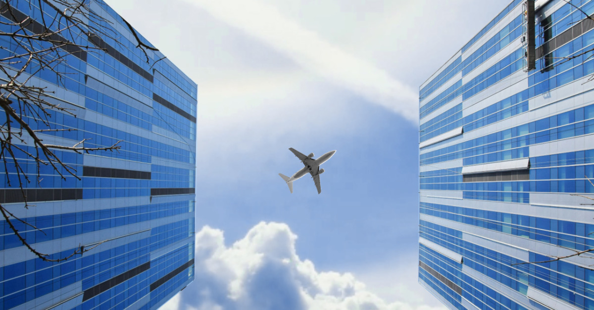 飞机飞过建筑物,云朵飘动,4K 延时摄影