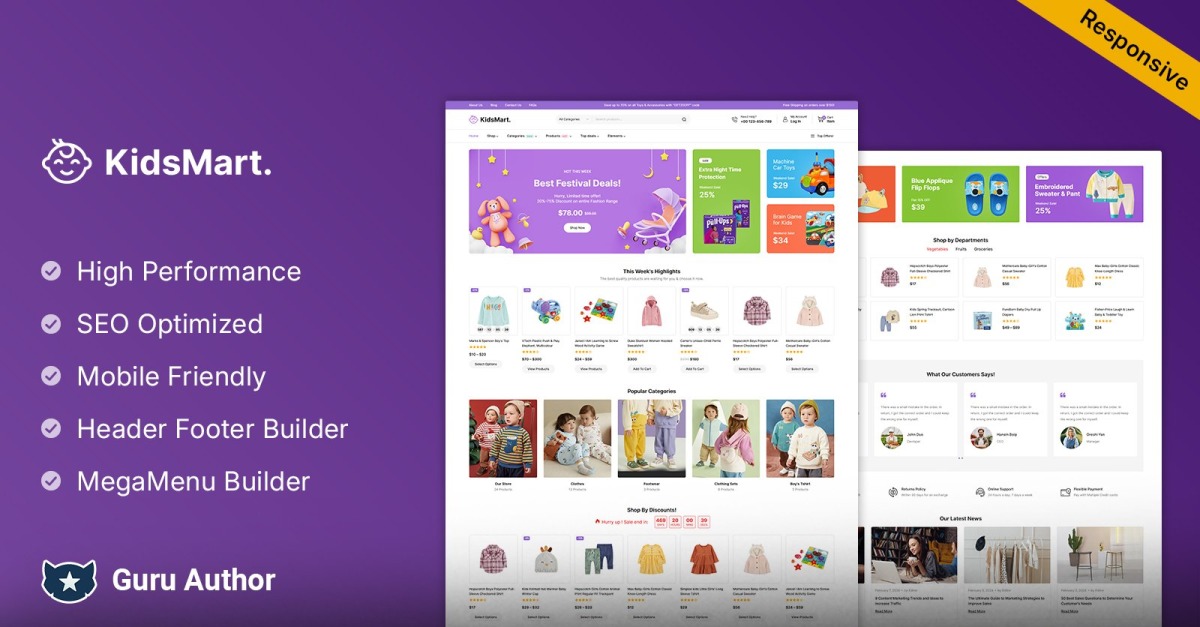 - 响应式设计: KidsMart 完全响应式设计针对台式机、平板电脑和智能手机进行了优化,确保在所有设备上实现无缝的购物体验。
