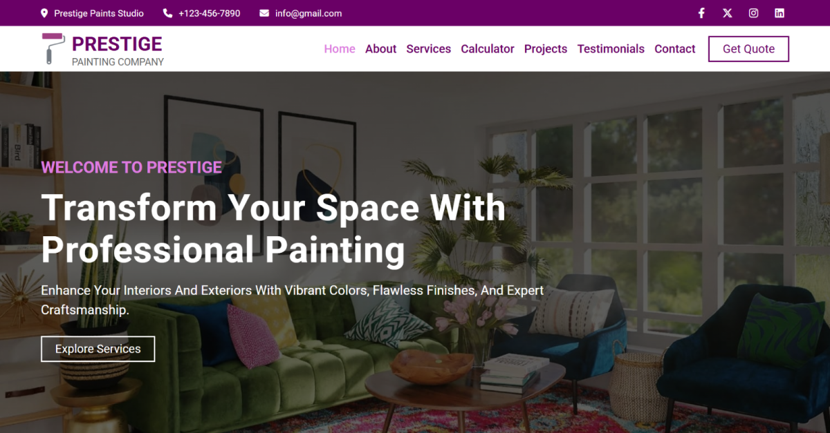 Prestige ist eine professionelle HTML5-Landingpage-Vorlage, die speziell für Maler, Renovierungsexperten und Heimwerker entwickelt wurde. Entwickelt mit den neuesten HTML5-, CSS3- und JavaScript-Technologien bietet sie ein modernes, elegantes und vollständig responsives Benutzererlebnis auf allen Bildschirmgrößen. Ideal für die Präsentation von Innenraumgestaltungen, Außenanstrichprojekten, Farbberatungen und Kundenreferenzen.