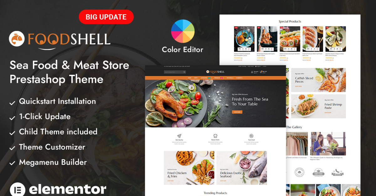 Foodshell – das responsive PrestaShop-Theme für Fischrestaurants – wurde speziell für Fischrestaurants, Fischmärkte, Bio-Fischhändler, Feinkostläden und Anbieter von Küstenprodukten entwickelt. Mit seinem frischen, klaren und appetitanregenden Layout präsentiert Foodshell Ihre Fischprodukte elegant und unterstreicht deren Qualität und Frische. Gleichzeitig bietet es ein angenehmes und benutzerfreundliches Einkaufserlebnis.