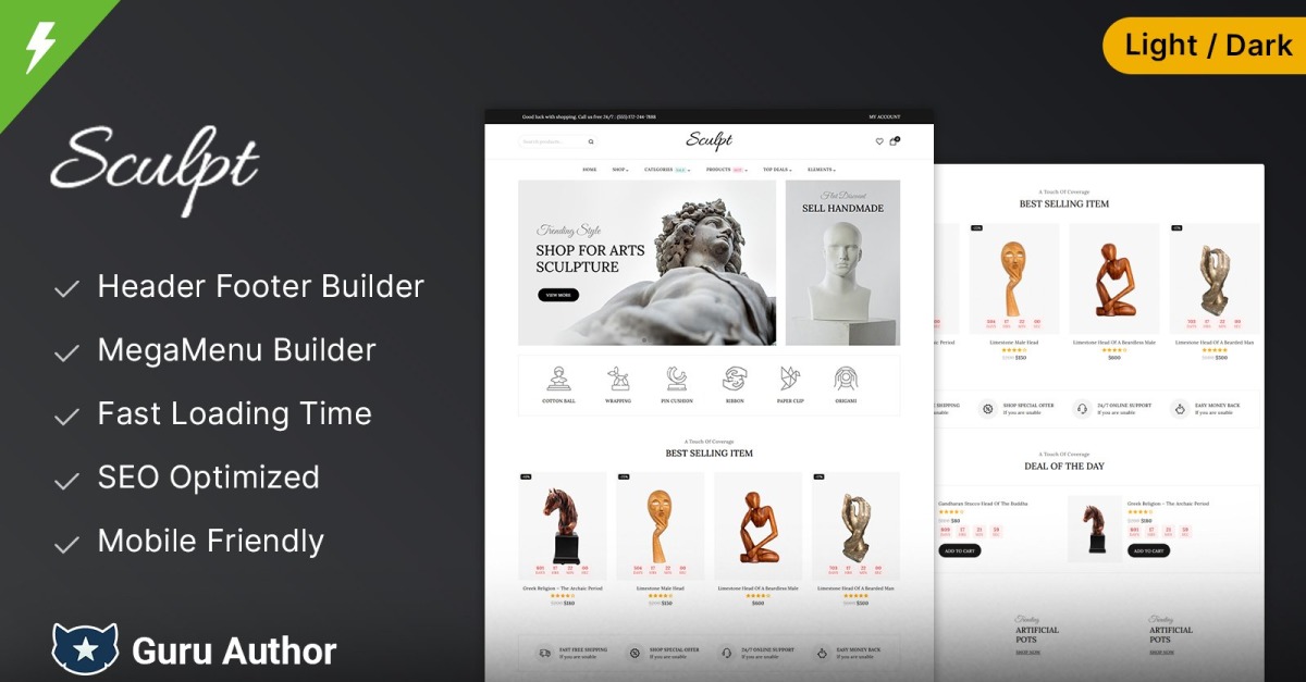 Sculpt ist ein wunderschön gestaltetes WooCommerce-Theme , das speziell für Bildhauer, Kunstgalerien, Museen und Kreativstudios entwickelt wurde. Ob Sie zeitlose Skulpturen, Kunstsammlungen oder kunstbezogene Produkte präsentieren – Sculpt bietet eine anspruchsvolle und funktionale Plattform für Ihren Online-Auftritt. Dank der integrierten Elementor -Technologie bietet es umfassende Anpassungsmöglichkeiten und ermöglicht Ihnen mühelos die Gestaltung beeindruckender Seiten – ganz ohne Programmierkenntnisse!